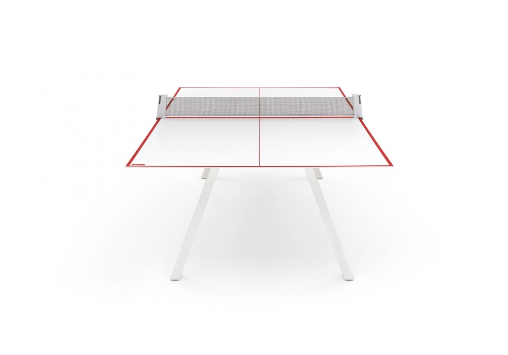 Grasshopper Outdoor von Basaglia + Rota Nodari für Fas Pendenza entworfen ist ein viereckiger Outdoor-Pingpong-Tisch mit einem Spielfeld, das aus zwei Teilen aus Agglomeratholz besteht. Die Struktur besteht aus Metall mit einem vierbeinigen Untergestell. Grasshopper ist vollständig weiß mit roten Details lackiert und wird mit 2 Schlägern und 6 Bällen geliefert.
