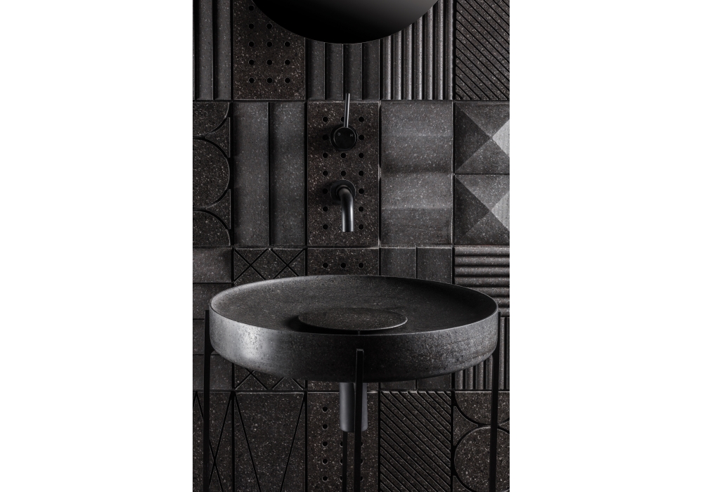 Etna von Martinelli Venezia Studio für Lithea entworfen, ist ein Standwaschbecken aus Stein, verfügbar in verschiedenen Ausführungen. Verfügbar mit oder ohne Spiegel.
