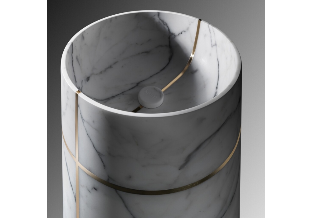 Tao von Marco Piva für Kreoo entworfen, ist ein zylindrisches freistehendes Waschbecken aus Marmor in verschiedenen Ausführungen und vertikal durchzogen von Messing-Metalleinsätzen.