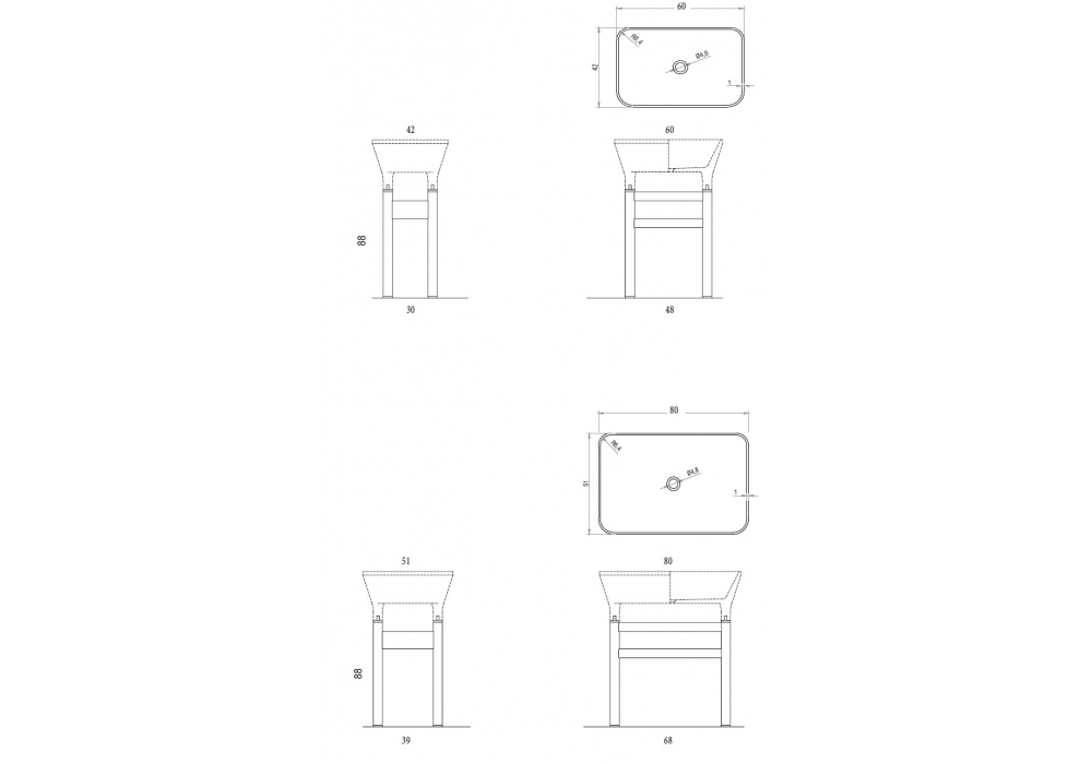 | Abmessungen | 60 x 42 x H 88 cm; 80 x 51 x H 88 cm. |