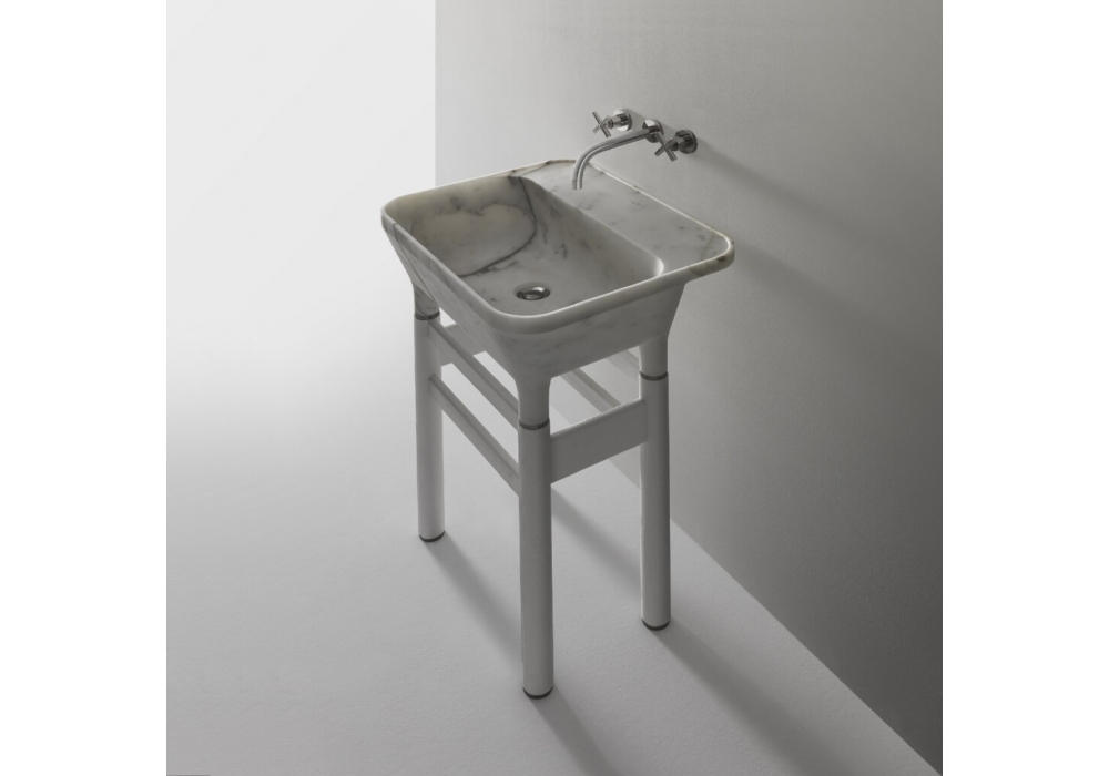 Loto 02 von Enzo Berti für Kreoo entworfen, ist ein freistehendes Waschbecken mit Lärchenbeinen und Wanne mit Marmorplatte in verschiedenen Ausführungen. Verfügbar in mehreren Abmessungen.