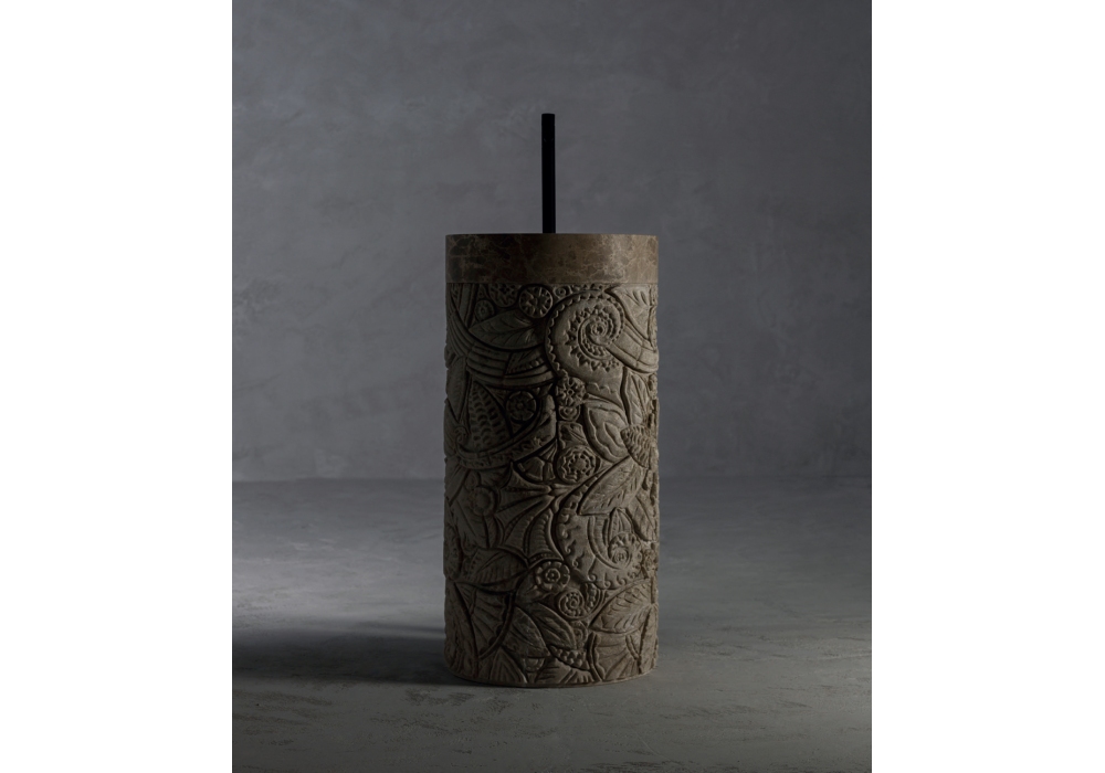 Mercy von Christophe Pillet für Kreoo entworfen ist ein Säulenwaschbecken mit zylindrischer Form, das vollständig aus handgeformtem Marmor mit archaischen Motiven besteht. Der obere Ring hat eine glatte Oberfläche mit mattem Finish. Mercy ist in verschiedenen Ausführungen erhältlich.
