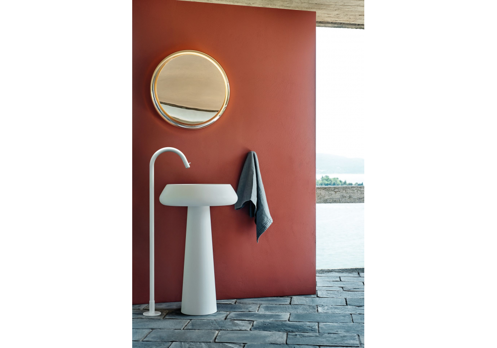Bjhon 2 von Angelo Mangiarotti für Agape entworfen, ist ein Standwaschbecken aus Marmor oder Cristalplant® biobased. Es zeichnet sich durch ein zylindrisches Becken und eine Bodenhalterung aus. Es gibt kein Hahnloch; freier Abfluss. Verfügbar in der Version mit Wand- oder Bodenablauf.