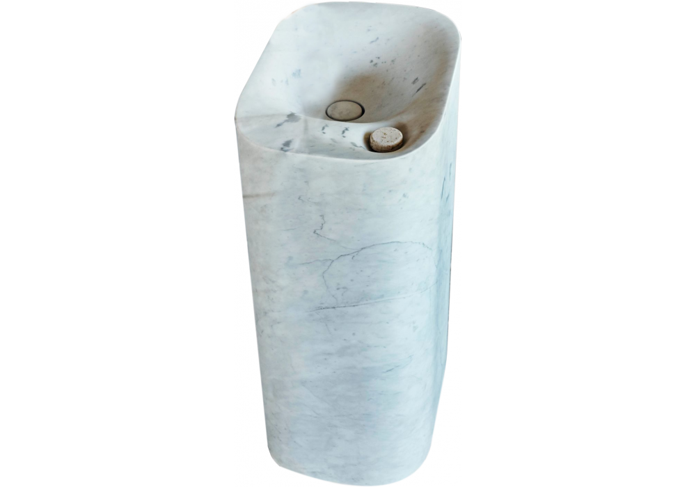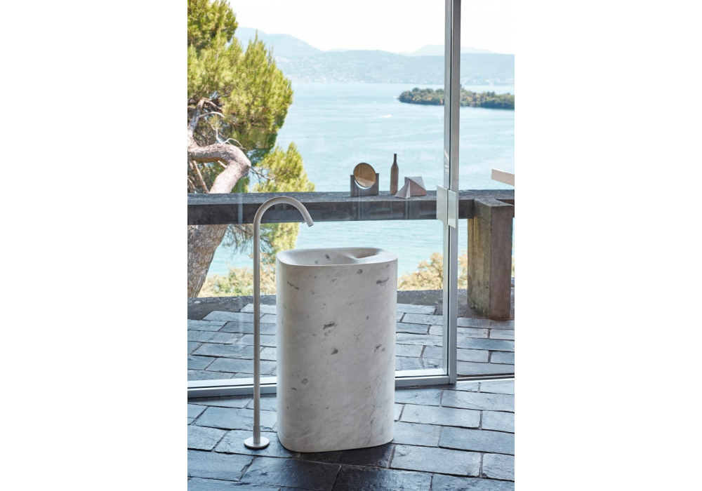 Nivis von Andrea Morgante (Shiro Studio) für Agape entworfen, ist ein rechteckiges Standwaschbecken aus Cristalplant® biobased oder Marmor in verschiedenen Ausführungen. Es gibt kein Hahnloch. Es verfügt über ein Überlaufloch aus einer kleinen Vertiefung, die mit dem Hauptbecken verbunden ist und gleichzeitig als Seifenschale dient. Verfügbar in der Version mit Wand- oder Bodenablauf.