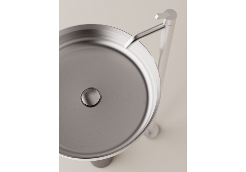 Undici Inox von Benedini Associati ist ein säulenförmiges Waschbecken aus Edelstahl oder Messing, das durch Blechdrehen hergestellt wird. Es ist nicht für den Wasserhahn vorgesehen; ein freier Abfluss. Außenseite in mattweiß oder mattschwarz lackiert. Die Säule hat immer die gleiche Außenoberfläche wie das Waschbecken und ist für den Wand- oder Bodenablauf vorgesehen.