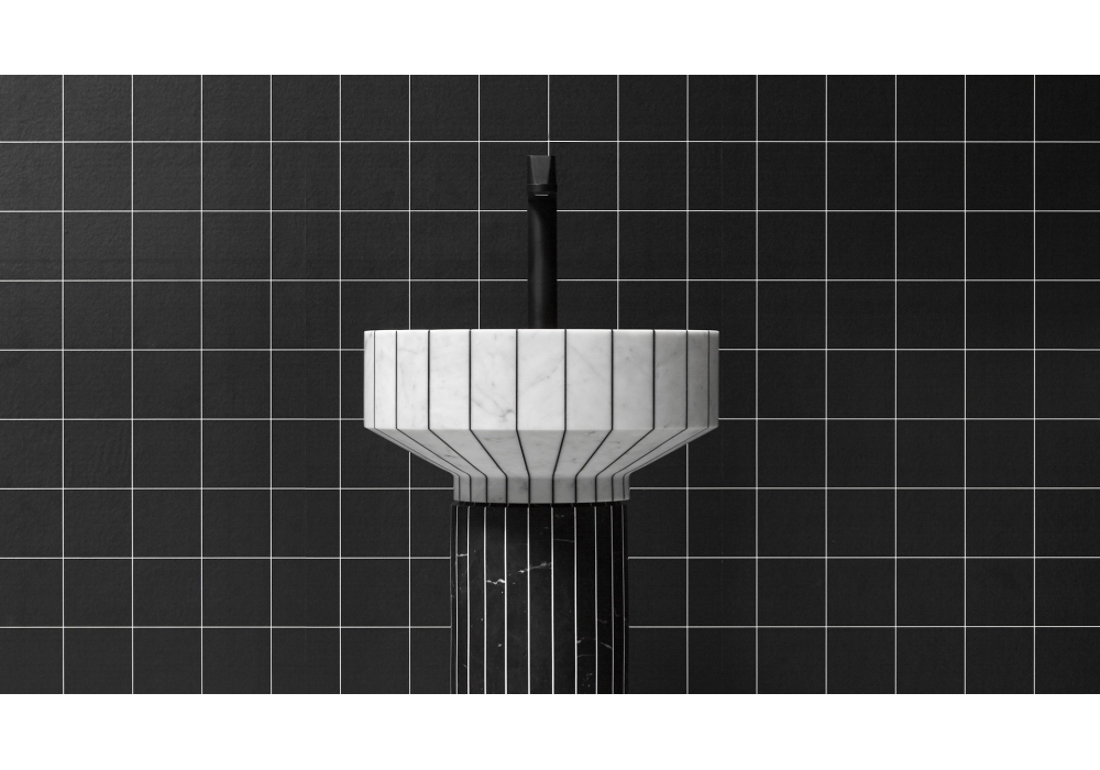 024 von Gumdesign für Antonio Lupi entworfen, ist ein bodenstehendes Waschbecken bestehend aus einer Säule aus Nero Marquinia-Marmor und einem Becken aus Carrara-Marmor, mit Bodenablauf, komplett mit offenem Abfluss, Siphon und flexiblem Schlauch.