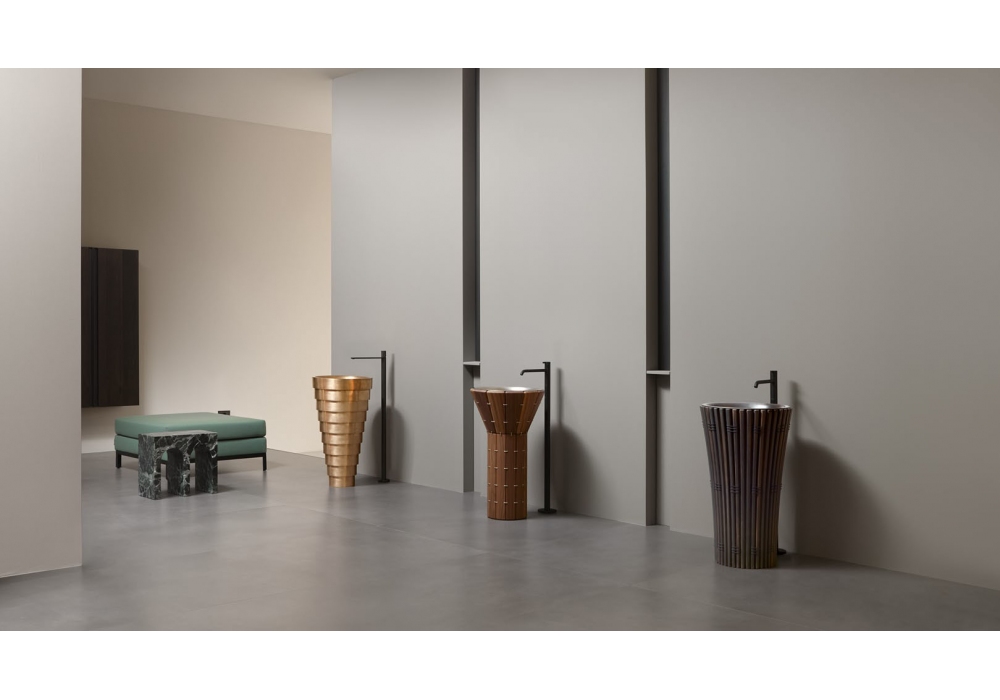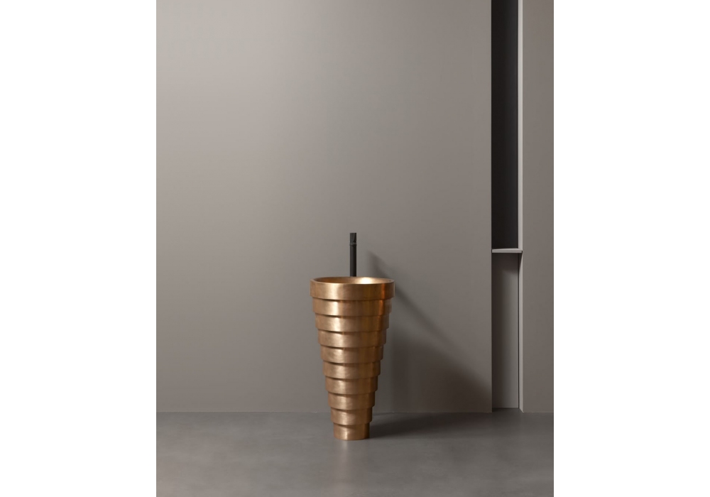 Cheope von AMDL Circle für Antonio Lupi entworfen, ist ein bodenstehendes Waschbecken aus satinierter Bronze oder dunkel patiniertem Metall. Es wird komplett mit freistehendem Abfluss, Siphon und flexiblem Schlauch geliefert.
