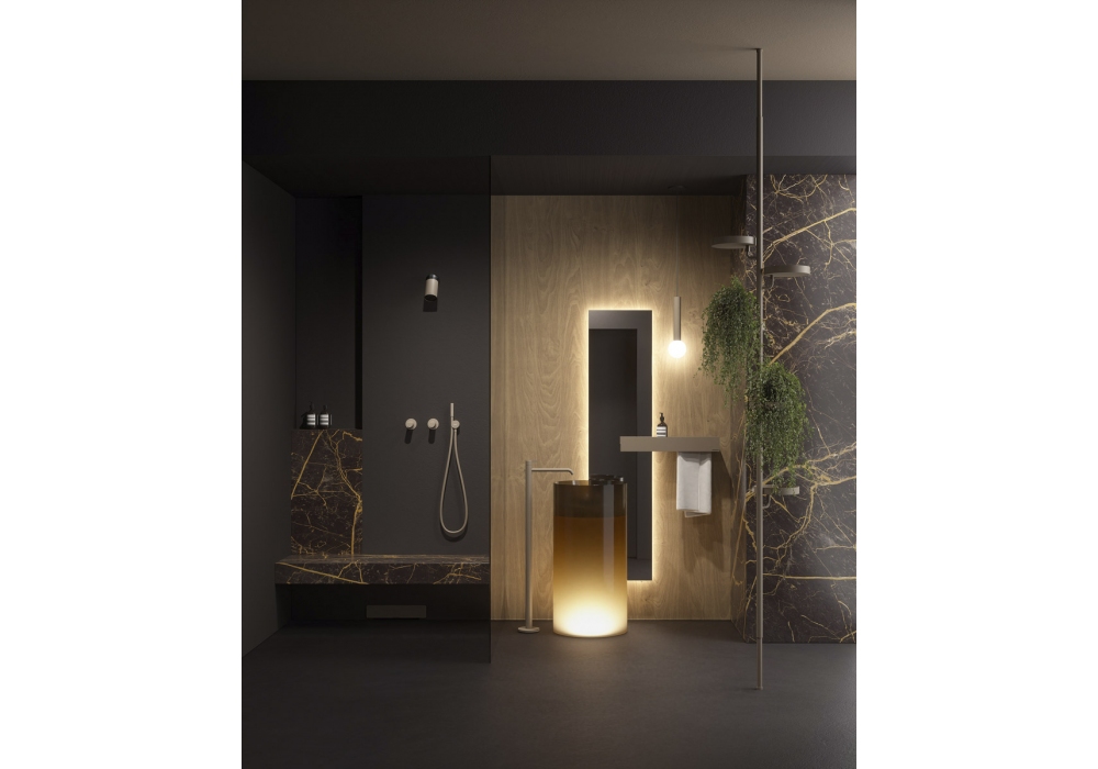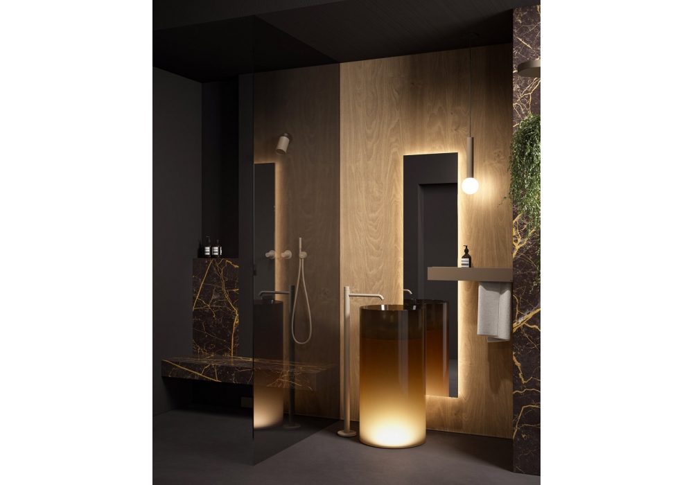 Breeze von Antonio Lupi entworfen, ist ein bodenstehendes Waschbecken aus Cristalmood oder Icemood mit Bodenablauf, mit oder ohne LED-Beleuchtung, erhältlich in verschiedenen Farben, mit einem matten Körper, komplett mit offenem Ablauf, Siphon und starrem Rohr.