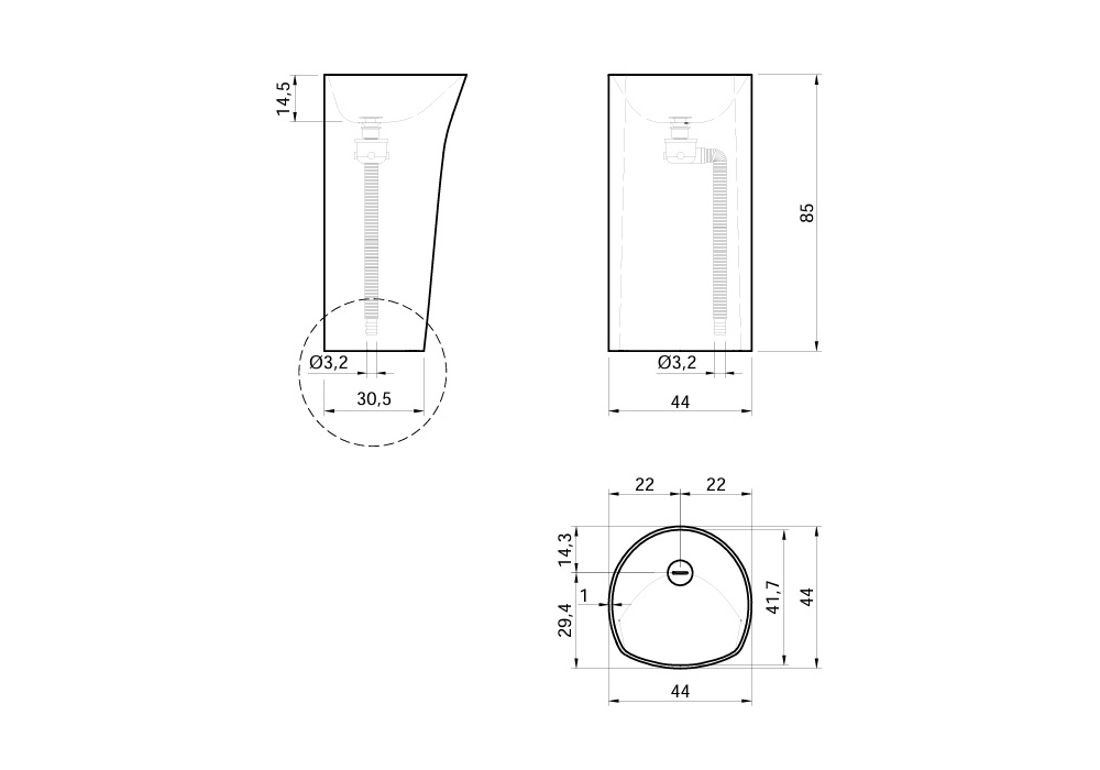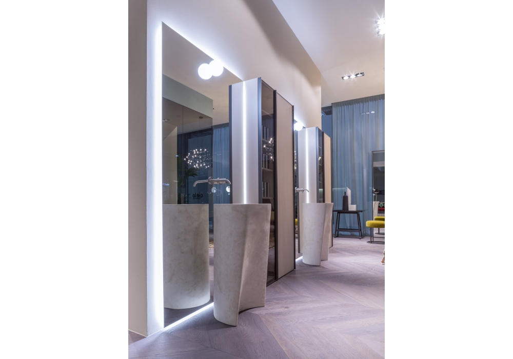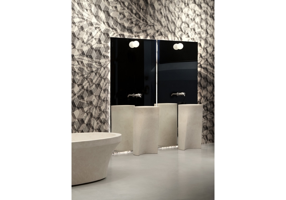 Rilievo von Carlo Colombo für Antonio Lupi entworfen, ist ein bodenstehendes Waschbecken aus Stein mit Bodenablauf, komplett mit offenem Abfluss, Siphon und flexiblem Schlauch.