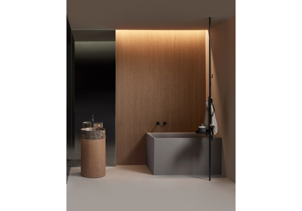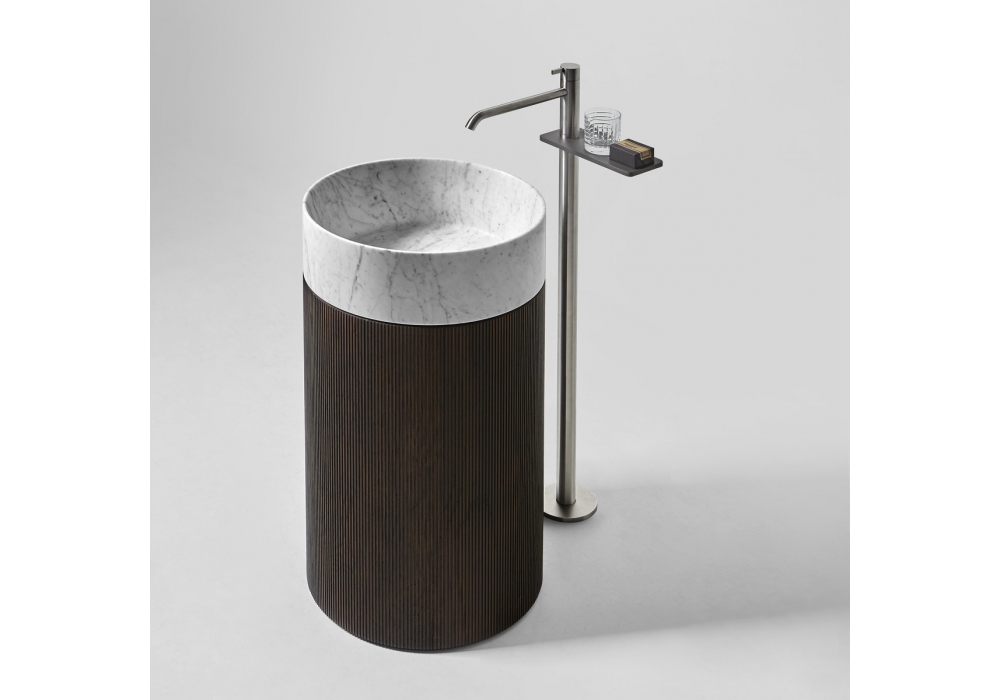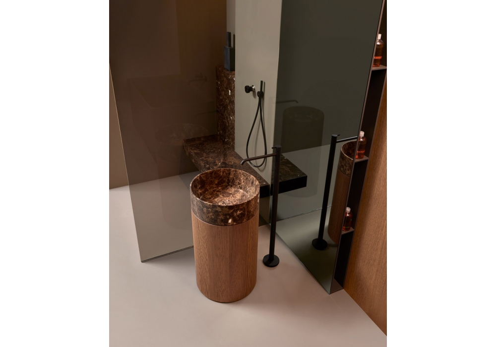 Rigatino von Antonio Lupi entworfen, ist ein bodenstehendes Waschbecken mit einem Becken aus Flumood, Colormood oder Stein und einem Holzsockel. Es wird komplett mit Bodenablauf, Freilauf, Siphon und flexiblem Schlauch geliefert.