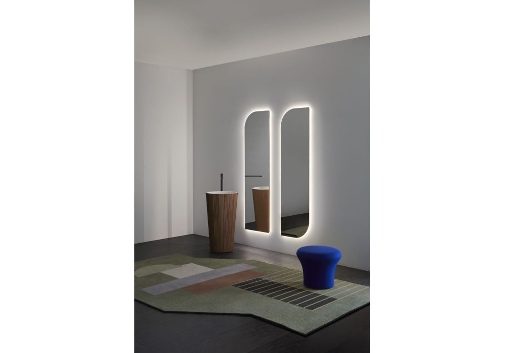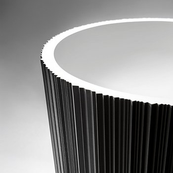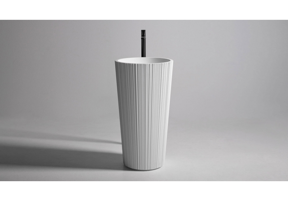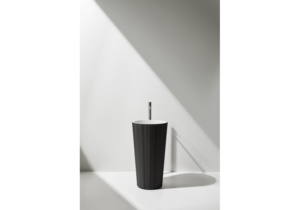 Plissé von Paolo Ulian für Antonio Lupi entworfen, ist ein bodenstehendes Waschbecken mit Flumood-Becken und Bodenablauf, komplett mit offenem Ablauf, Siphon und flexiblem Schlauch.
