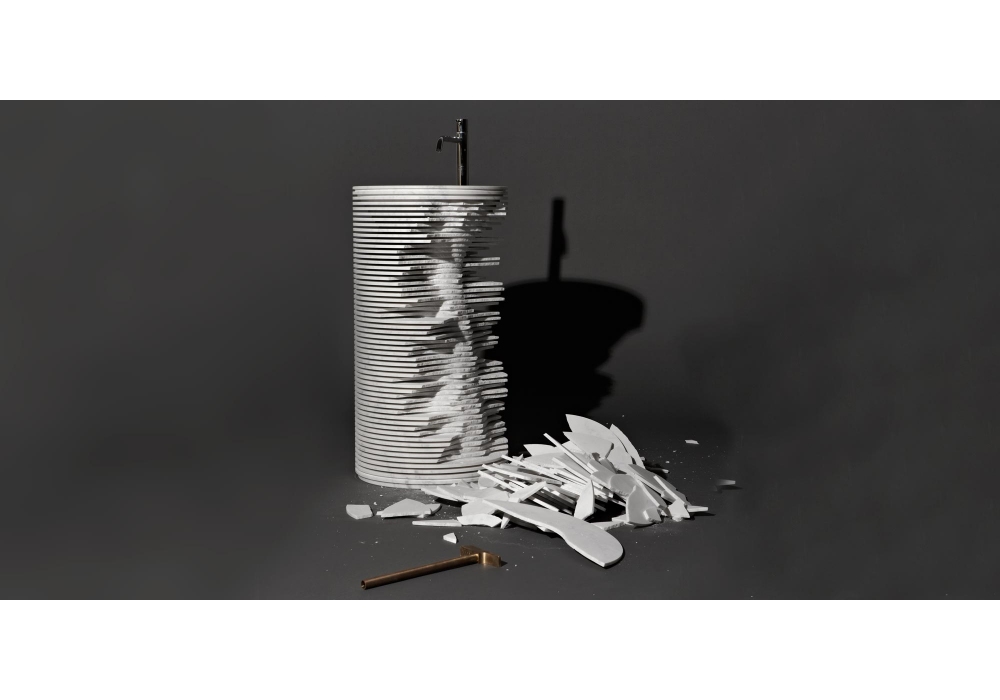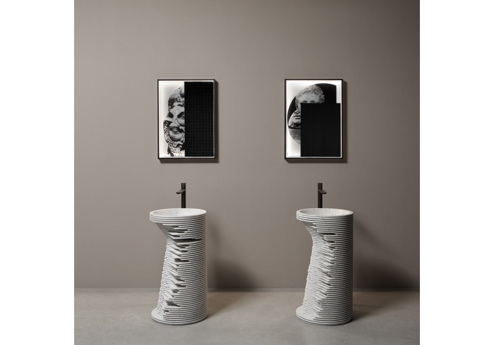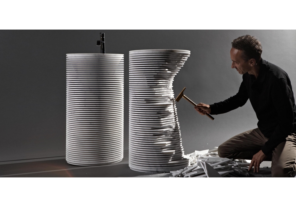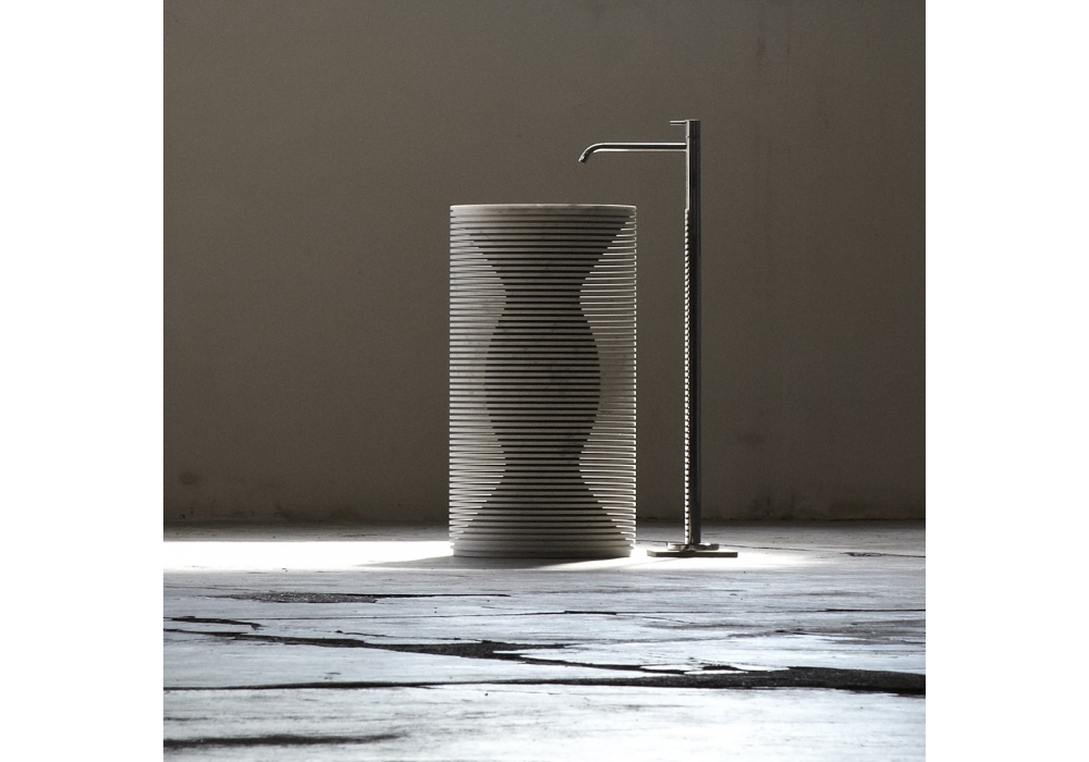 Introverso von Paolo Ulian für Antonio Lupi entworfen, ist ein bodenstehendes Waschbecken aus Stein mit Bodenablauf, komplett mit offenem Abfluss, Siphon und flexiblem Schlauch.