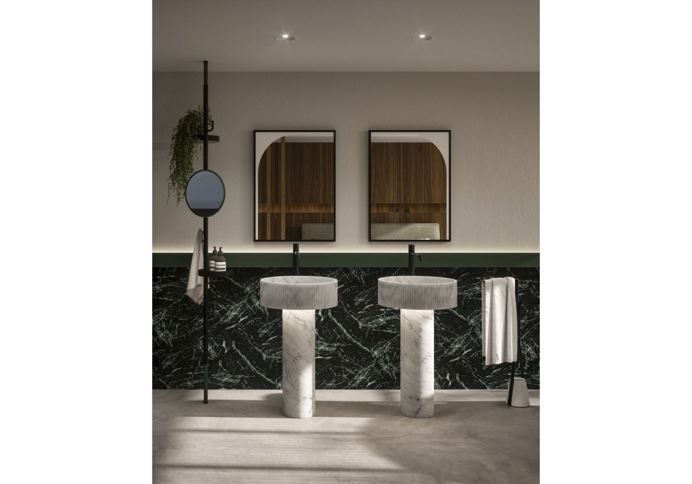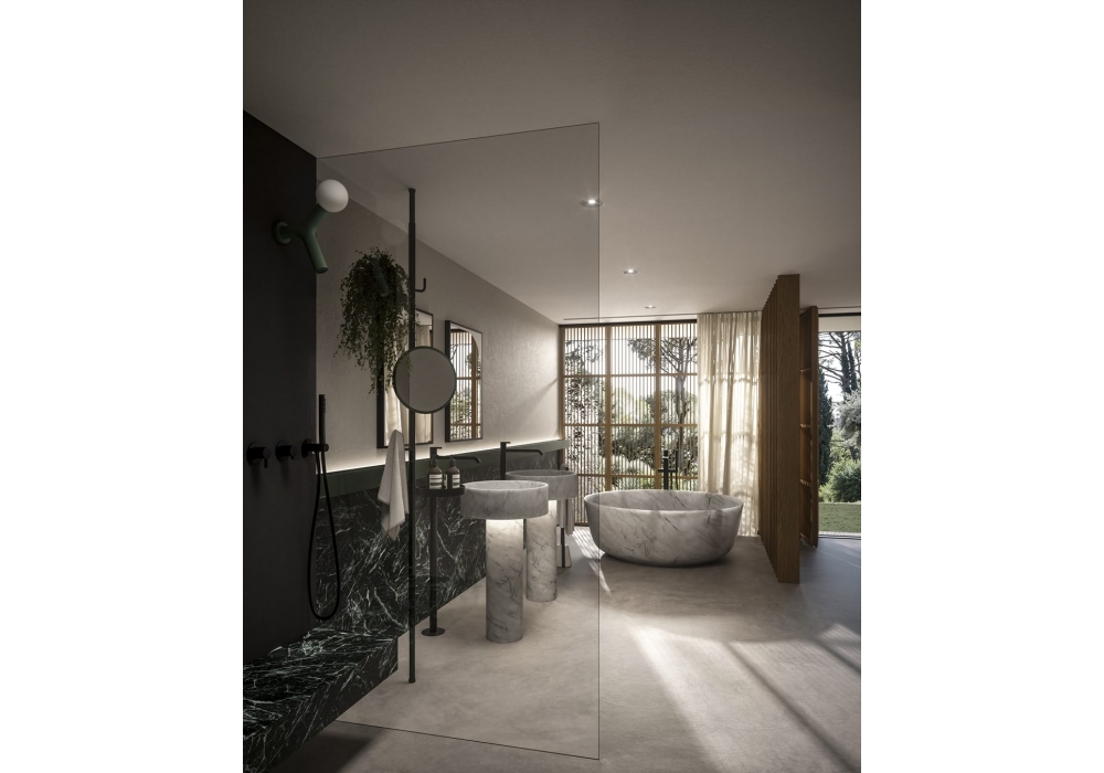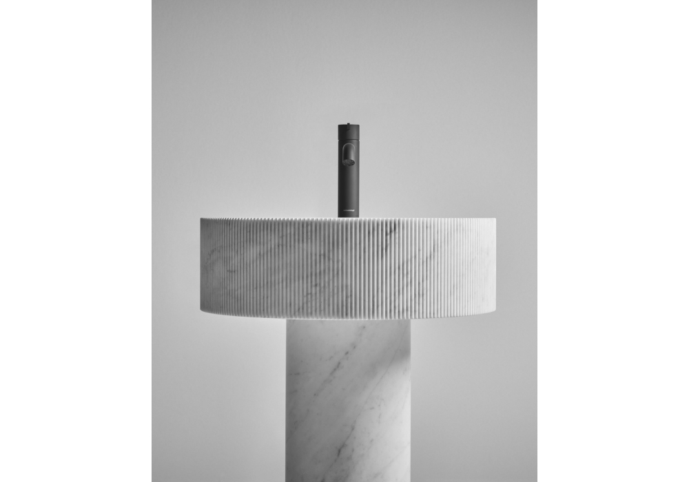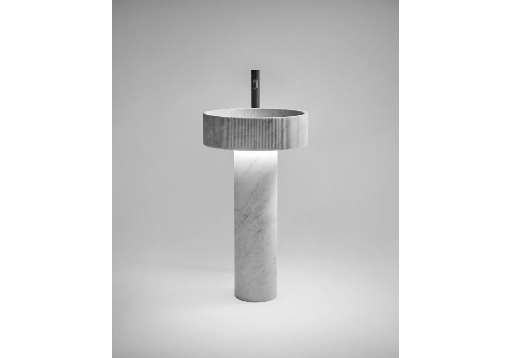 Filorigo von Paolo Ulian für Antonio Lupi entworfen, ist ein bodenstehendes Waschbecken aus Stein mit Bodenablauf, mit oder ohne LED-Beleuchtung, komplett mit offenem Abfluss, Siphon, starrem Rohr und in der LED-Version inklusive Transformator.