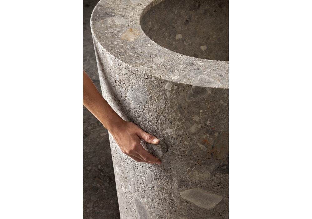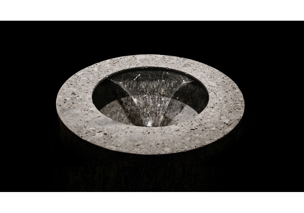 Anima liquida von Giorgio Rava für Antonio Lupi entworfen, ist ein bodenstehendes Waschbecken aus Stein mit bodenebenem Zulauf und Ablauf, komplett mit hydroprogressiven Wasserhähnen mit Wasserfallstrahl, Abfluss mit offenem Stopfen und flexiblem Schlauch.