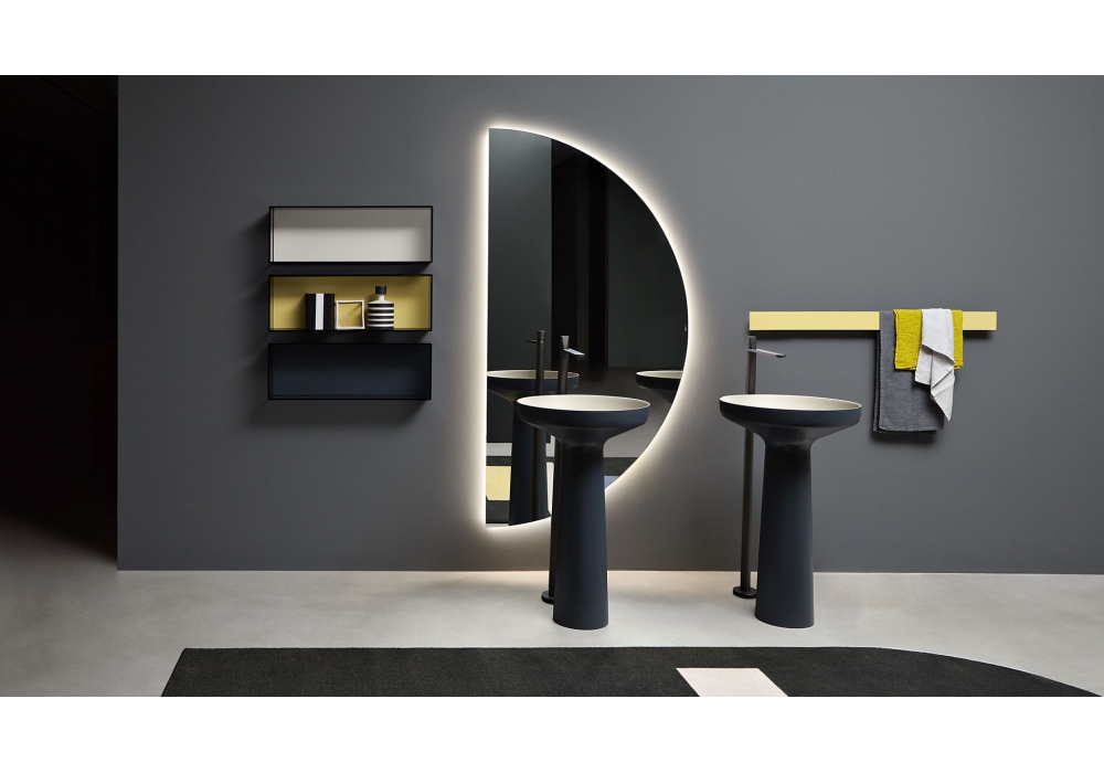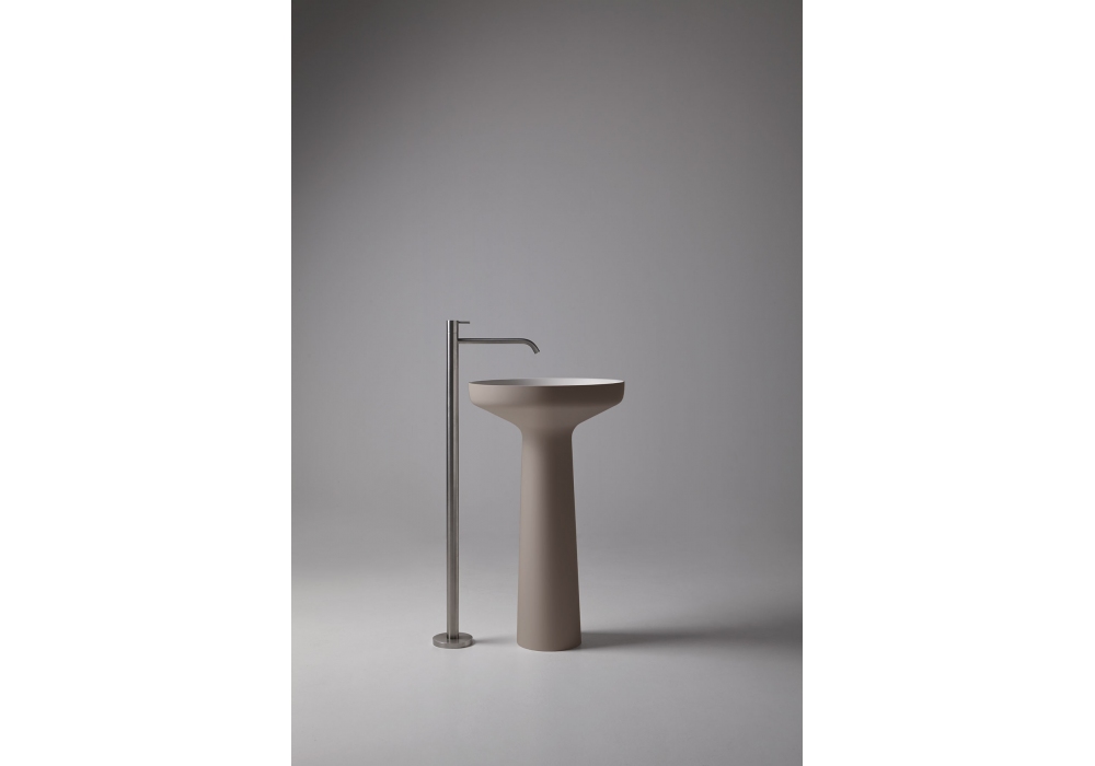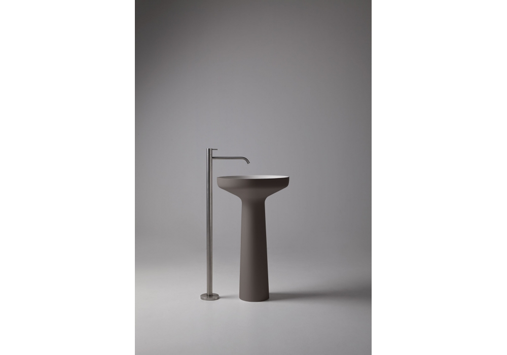 Ago85 von Mario Ferrarini für Antonio Lupi entworfen, ist ein bodenstehendes Waschbecken in Flumood oder Colormood mit Bodenablauf, komplett mit offenem Abfluss, Siphon und flexiblem Schlauch.