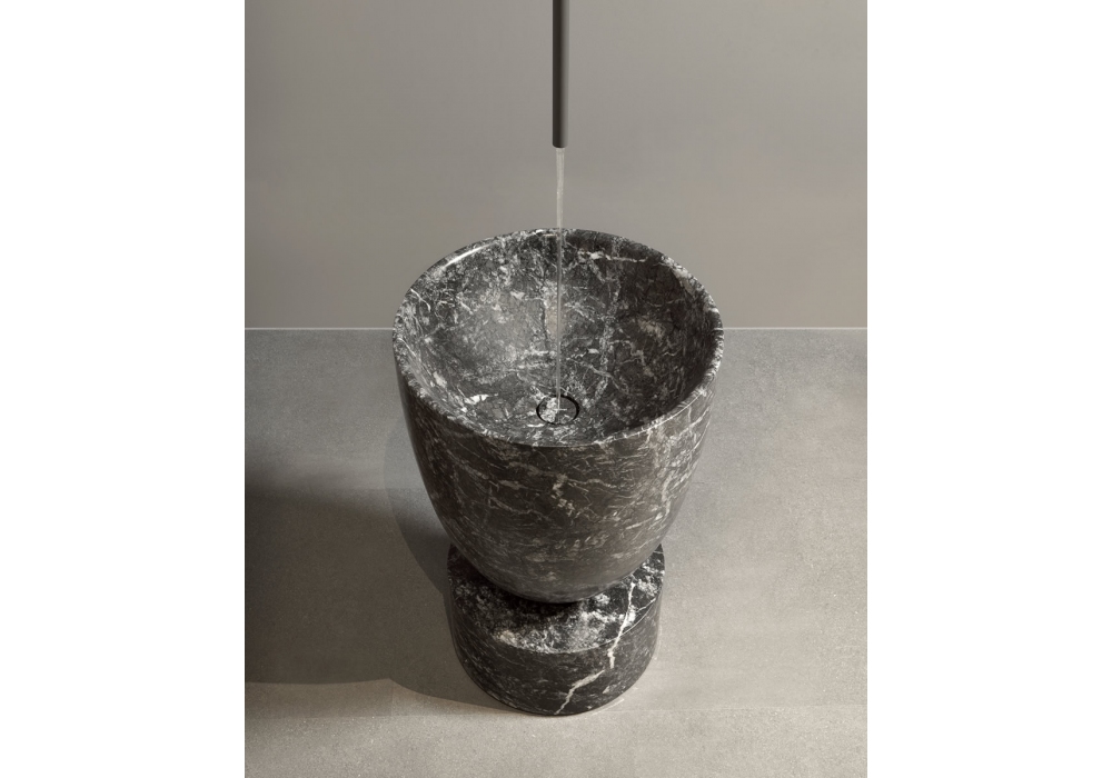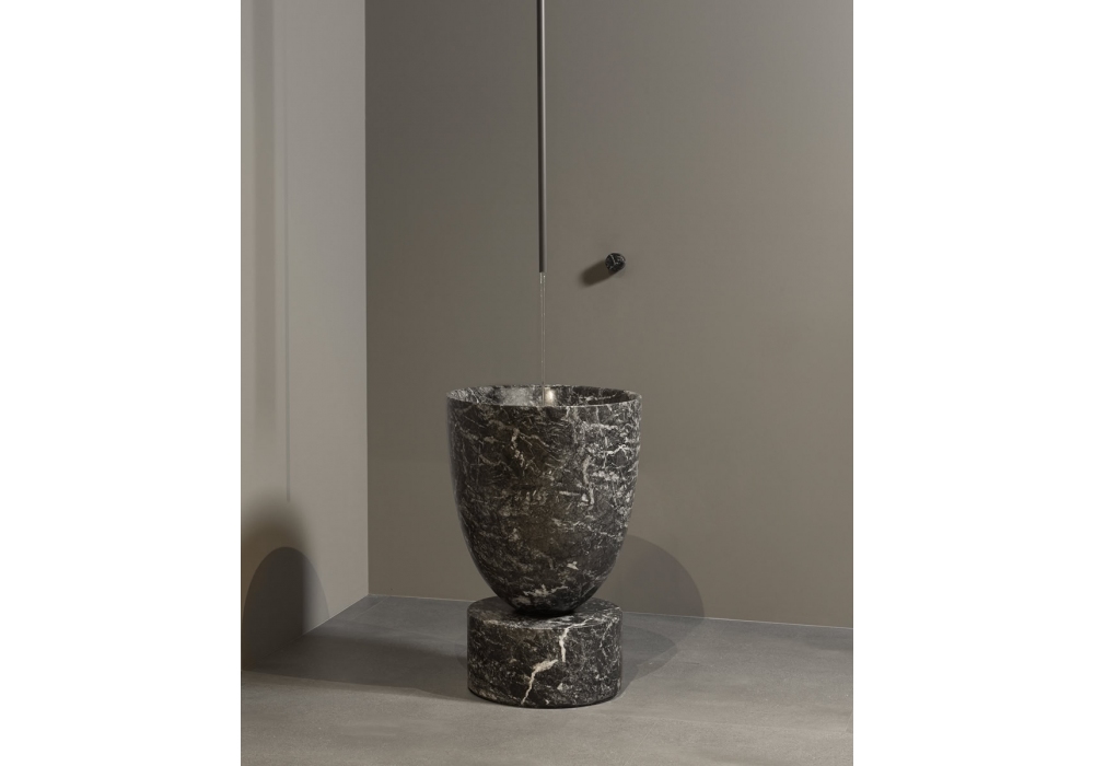 Arcadia von Mario Trimarchi für Antonio Lupi entworfen, ist ein bodenstehendes Waschbecken aus Stein. Es wird komplett mit Bodenablauf, offenem Ablauf, Siphon und starrem Rohr geliefert.