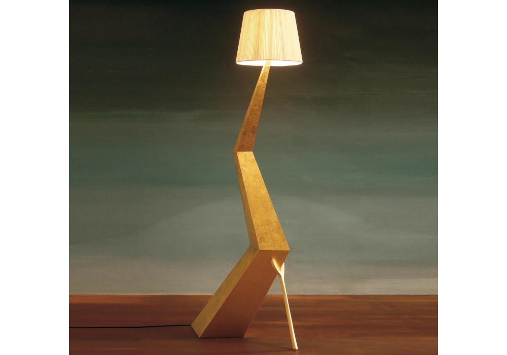 Bracelli, von Salvador Dalí für BD Barcelona Design entworfen, ist eine Stehlampe mit einer Holzbrettstruktur, die mit einer feinen Vergoldung bedeckt ist, die auch in einer dunkleren Version erhältlich ist. Der Lampenschirm ist mit elfenbeinfarbenem Baumwoll- und Viskosestoff bezogen.