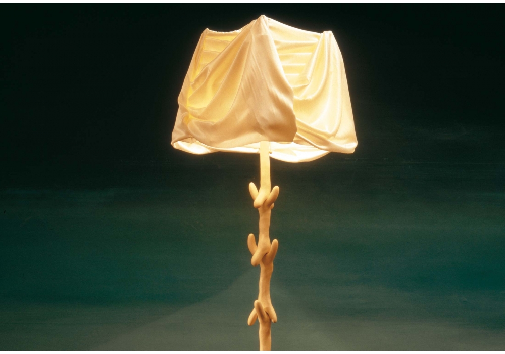 Muletas von Salvador Dalí für BD Barcelona Design entworfen, ist eine Stehleuchte aus gebleichtem, lackiertem oder schwarz gebeiztem und lackiertem Lindenholz. Der Lampenschirm ist mit beigem Satin bezogen oder gefüttert und mit transparentem schwarzem Chiffon bezogen.