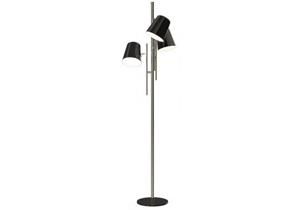 Cole, entworfen von DelightFULL, ist eine Stehlampe, die ein Design mit drei Lampenschirmen mit einem glänzend schwarzen Äußeren und einem mattweißen Inneren aufweist. Dreikegelige Lampenschirme bieten viele Stile und eine flexible Beleuchtung.