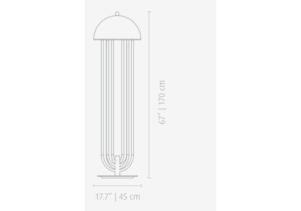 Turner, entworfen von DelightFULL, ist eine Stehleuchte, die aus fünf drehbaren Messingbögen und einer halbkugelförmigen oberen Abdeckung aus glänzend weiß lackiertem Aluminium besteht.