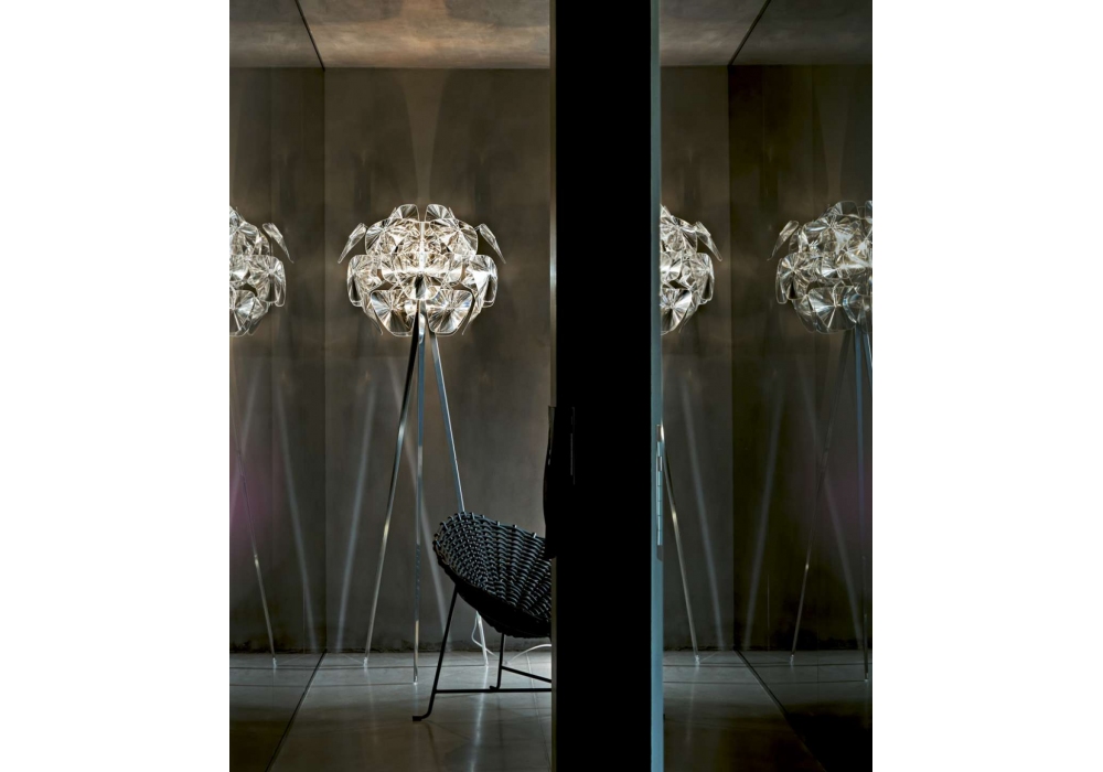 Hope von Francisco Gomez Paz und Paolo Rizzatto für Luceplan entworfen, ist eine Stehleuchte mit Struktur aus poliertem Stahl und transparentem Polycarbonat. Diffusor aus prismatischen Linsen aus Methacrylat. Die Helligkeit wird über einen Fußdimmer geregelt.