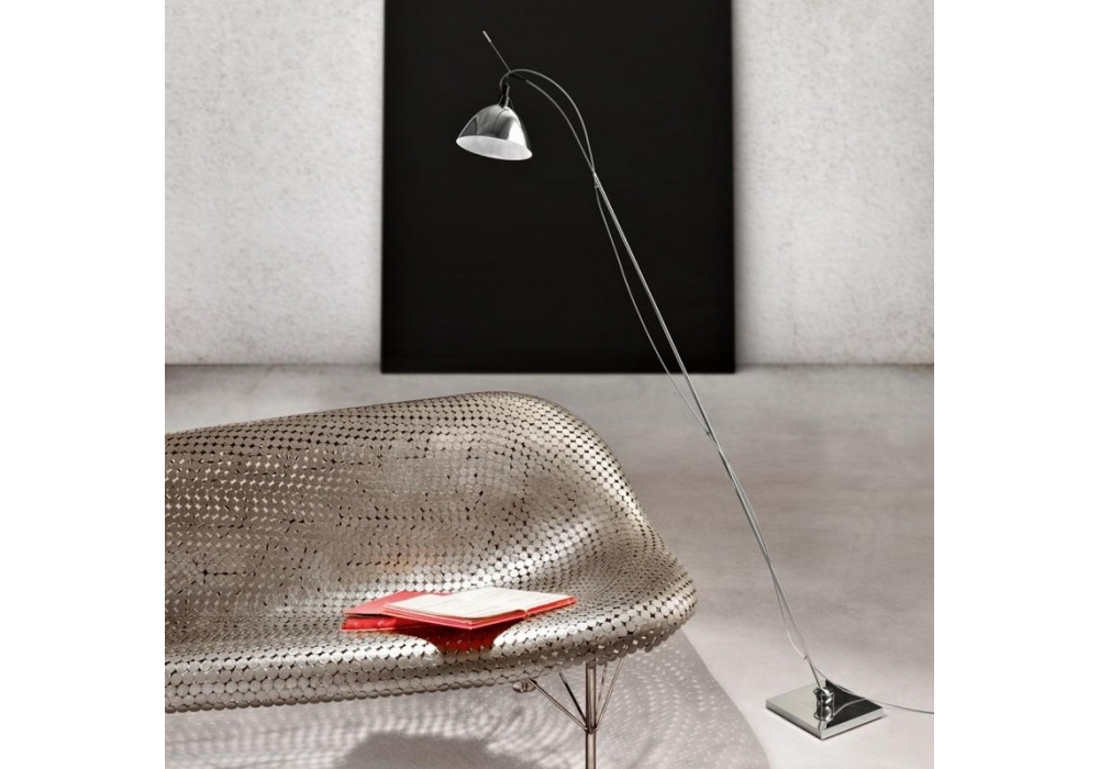 Max. Floor, entworfen und hergestellt von Ingo Maurer, ist eine Stehleuchte aus reinem Aluminium und Edelstahl. Über ein Kugelgelenk stufenlos in alle Richtungen dreh- und neigbar. Der Diffusor ist in poliertem Aluminium oder mattschwarz erhältlich.
