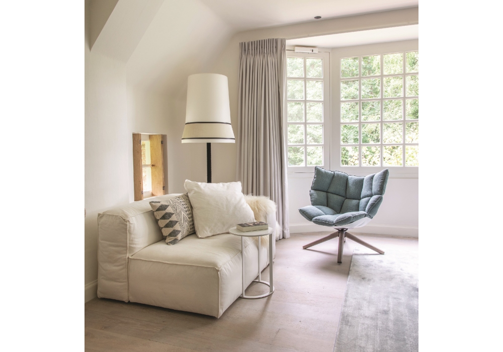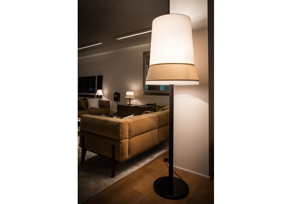 Audrey von Massimiliano Raggi für Contardi entworfen ist eine Stehleuchte mit rundem Sockel und Stiel, der mit einem geflochtenen Kabel aus schwarzer Seide bedeckt ist. Der Lampenschirm besteht aus Stoff, der mit Einsätzen aus verschiedenen Stoffarten angereichert ist. Die verwendeten Lichtquellen verfügen über eine E27-LED-Fassung mit Netzkabel mit schwarzem Stoffbezug und Ein-/Ausschalter. Audrey ist in verschiedenen Ausführungen erhältlich.