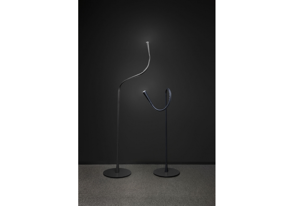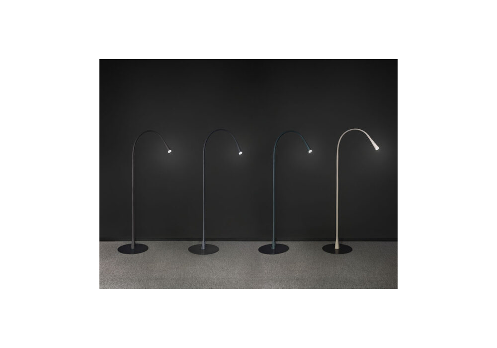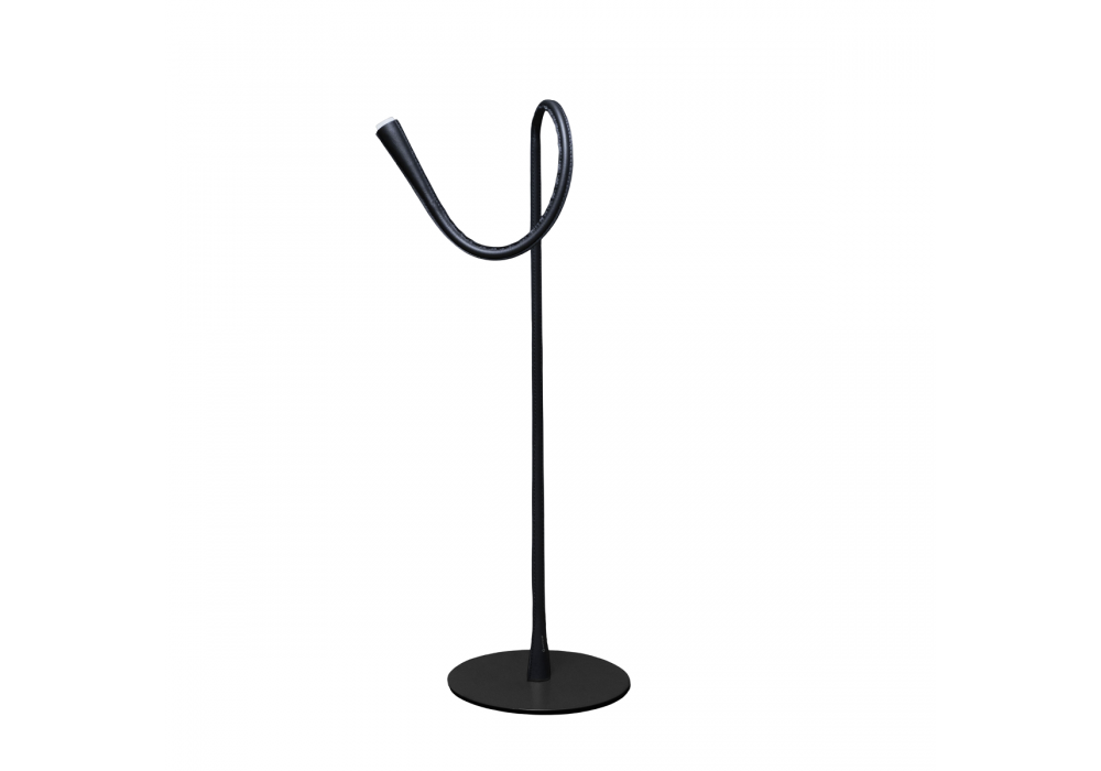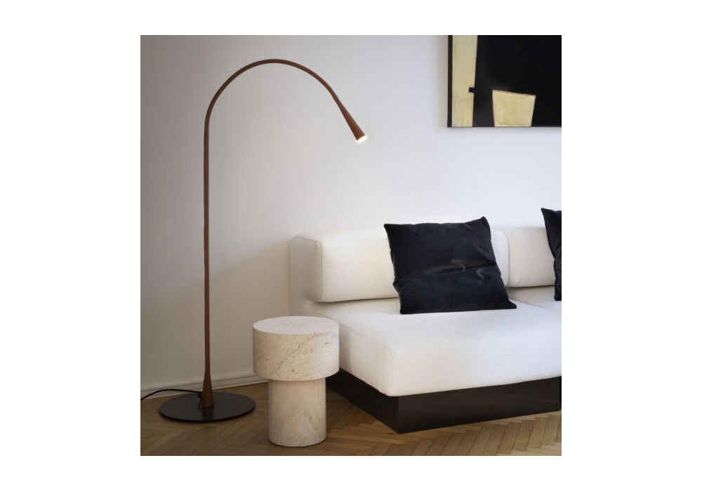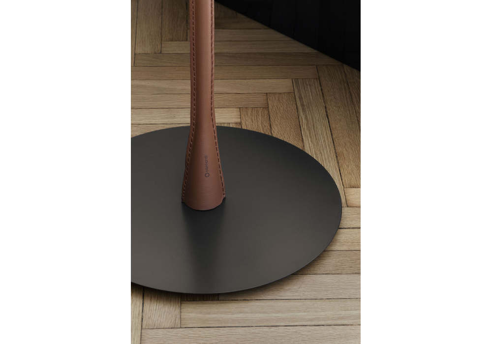 Flexiled von King & Roselli für Contardi entworfen, ist eine Stehleuchte mit einem dunkelbraunen, runden Fuß und einem flexiblen Arm aus Stahlgewebe. Der Leuchtenkopf ist mit Leder bezogen und verfügt über eine LED-Lichtquelle mit einem am Netzkabel befindlichen, fußbetätigten Dimmer.
