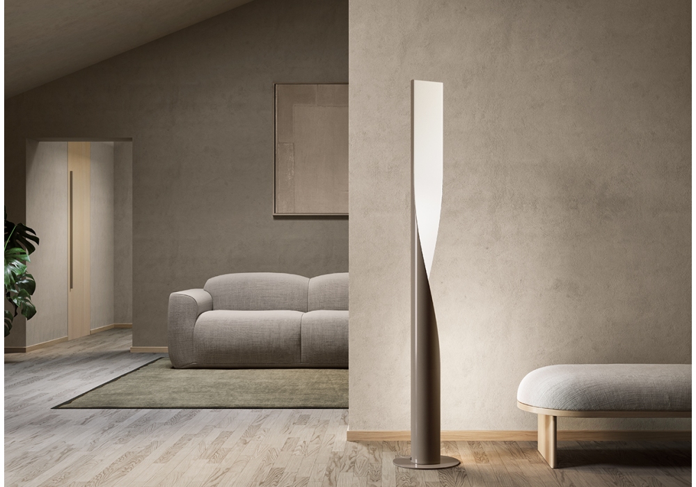 Evita von AquiliAlberg für Kundalini entworfen, ist eine dimmbare Stehleuchte mit Verbundstruktur aus Sperrholz gepaart mit Stahl und Technopolymeren und Diffusor aus heißgestrecktem Stoff. Verfügbar in verschiedenen Ausführungen.