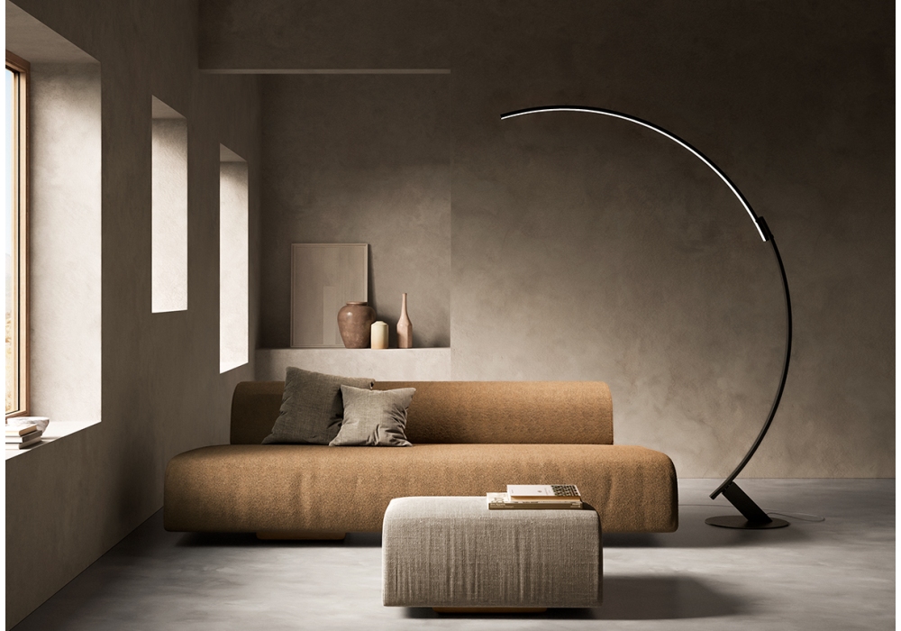 Kyudo von Hansandfranz für Kundalini entworfen, ist eine Stehleuchte mit Diffusor, der auf einer frei verstellbaren Gleitschiene montiert ist, Struktur aus glänzend lackiertem extrudiertem Aluminium und Niedervolt-LED-Streifen. Verfügbar in verschiedenen Ausführungen.