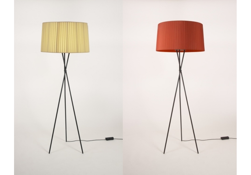 Tripode G5 von Santa&Cole Team entworfen, ist eine schöne Stehleuchte mit Metallstruktur und Lampenschirm verfügbar in verschiedenen Ausführungen. Ein Bündel von drei schwarzen Röhren, verbunden wie ein Satz von Stäbchen, hält eine großzügige Farbband Schatten. Wenn die Lampe ein warmes, warmes Licht liefert, steht sie wie eine große Skulptur und verleiht den Räumen einen Hauch von Klasse.
