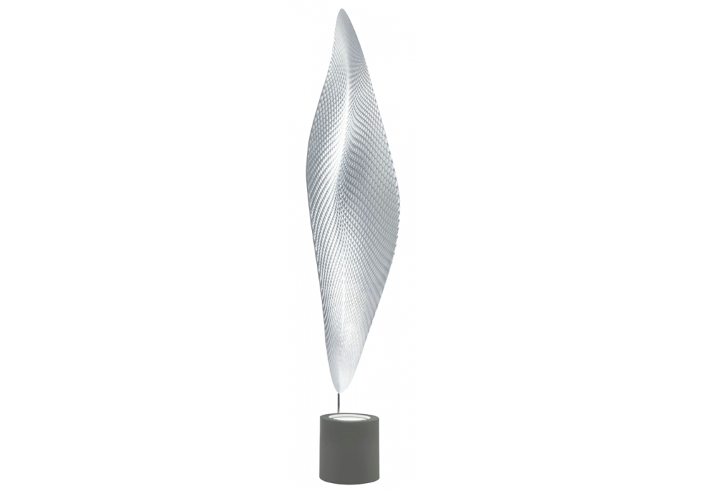 Cosmic Leaf von Ross Lovegrove für Artemide entworfen ist eine Stehleuchte mit zylindrischem Sockel aus lackiertem Metall. Der Leuchtenkörper ist mit einer LED-Lichtquelle in den Sockel integriert, während der Diffusor aus strukturiertem transparentem Methacrylat besteht.