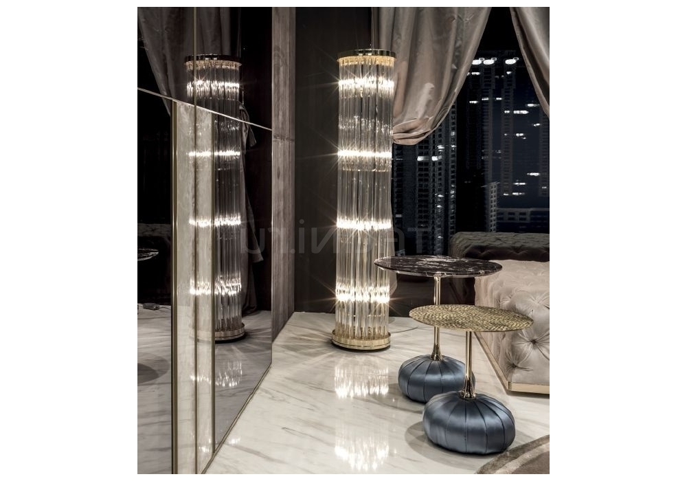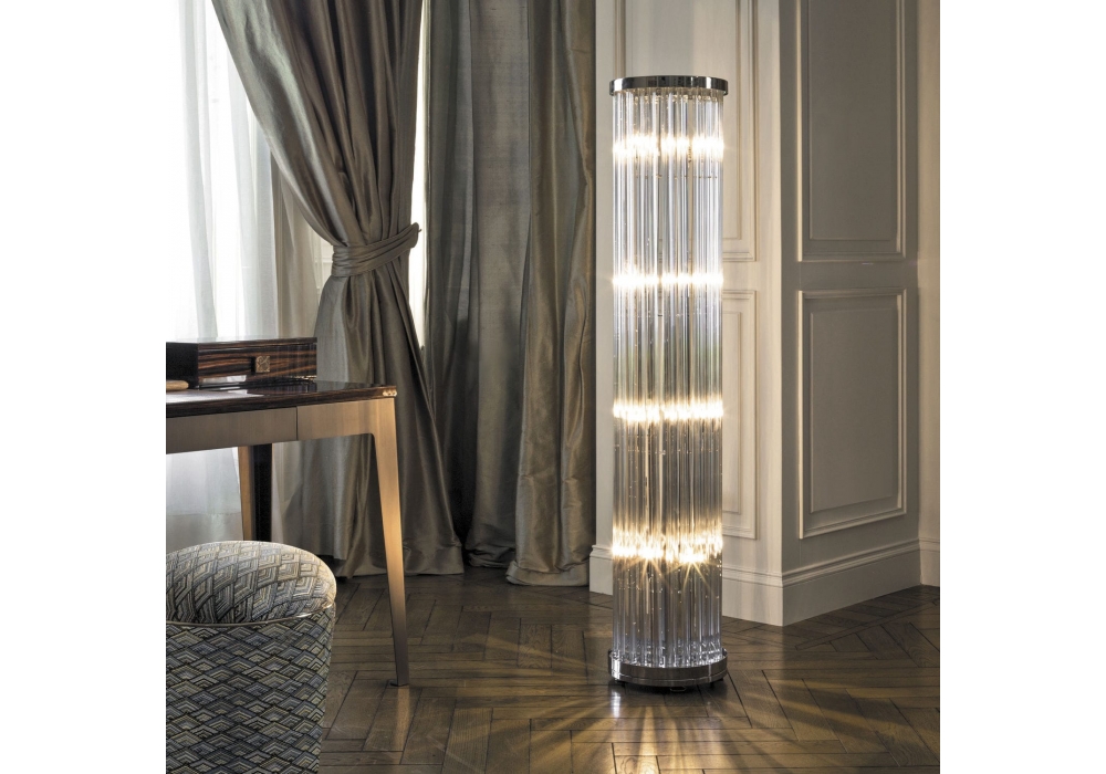 Elisabeth von Giuseppe Iasparra für Longhi entworfen, ist eine Stehleuchte mit Metallstruktur und Glaslamellen aus Murano-Kristall. Verügbar in mehrerer Ausführungen.