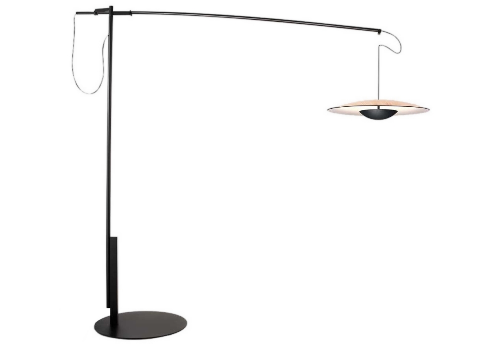 Ginger XL/XXL von Joan Gaspar für Marset entworfen, ist eine Stehleuchte mit Diffusor und gepresster Holzbasis von 4 mm in Eiche natur oder Wenge. Diffusor aus Aluminium und lackierter schwarzer Mattmetallstiel. Beweglicher Arm aus Kohlefaser, lackiert in matt schwarz. Auch verfügbar in 2 Größen.