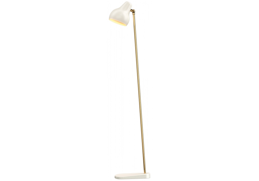 VL38 von Vilhelm Lauritzen für Louis Poulsen entworfen, ist eine Stehleuchte mit Sockel aus lackiertem Aluminiumdruckguss und Stab aus gebürstetem Messing. Der Diffusor besteht aus lackiertem Aluminium und schirmt eine LED-Lichtquelle ab, die von einem Kunststoffkabel mit Ein-/Ausschalter gespeist wird. VL38 ist in verschiedenen Ausführungen erhältlich.