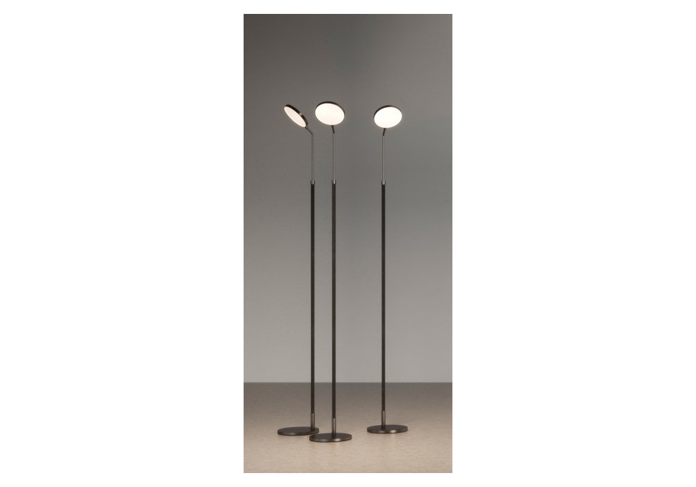 Spoon von Umberto Asnago für Penta entworfen, ist eine Stehleuchte mit Struktur aus mattem Metall und handgewebtem Leder in den folgenden Kombinationen: mattschwarzes/cognacfarbenes Leder oder mattschwarzes/schwarzes Leder oder ganz aus grauem Metall. Die gewählte Lichtquelle ist vom Typ LED mit Dimmersystem am Netzkabel.
