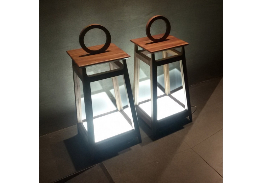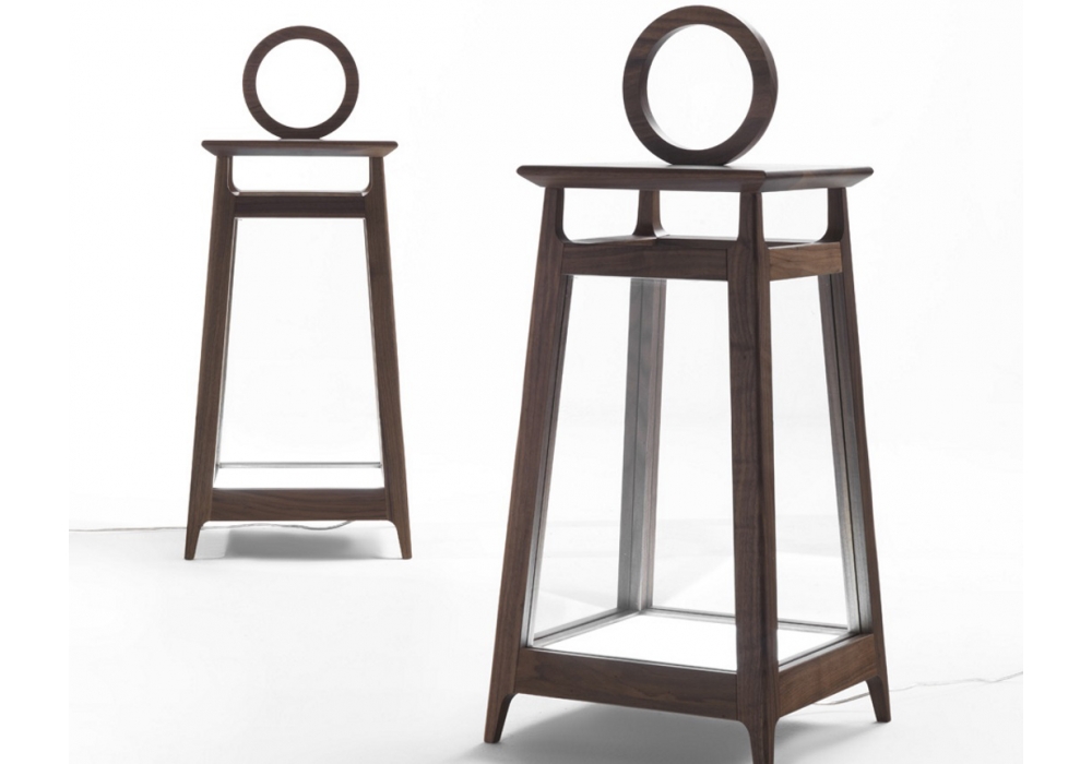 Amarcord, von P. Salvadé für Porada entworfen, ist eine Stehleuchte mit Struktur aus massivem Nussbaum Canaletta und klaren Glasscheiben. Gestell mit LED 3000° K Beleuchtung.