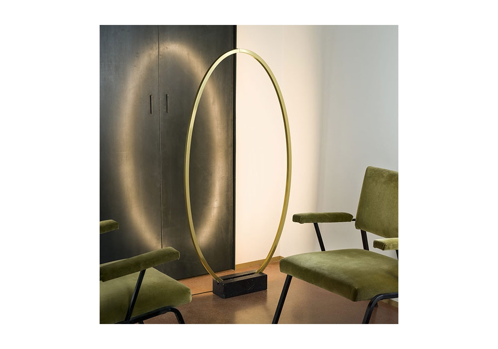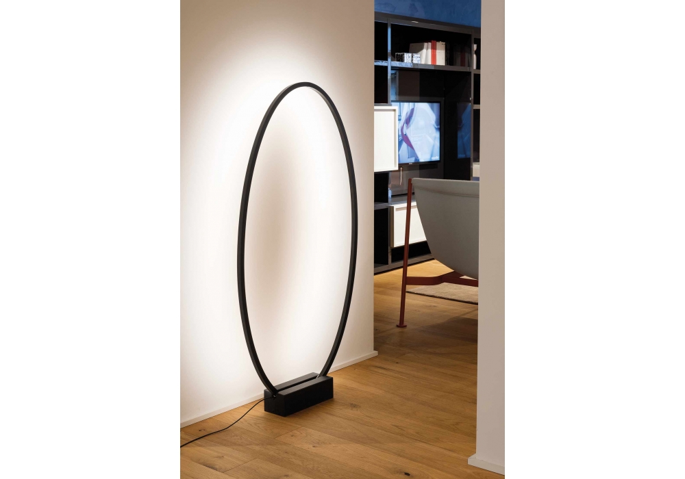 Ellisse, von Federico Palazzari für Nemo entworfen, ist eine elliptische Stehlampe aus lackiertem extrudiertem Aluminium und viereckiger Basis aus schwarzem Marmor. Der Diffusor ist aus opalem Methacrylat und schirmt eine dimmbare LED-Lichtquelle ab. Ellisse ist in verschiedenen Ausführungen erhältlich.