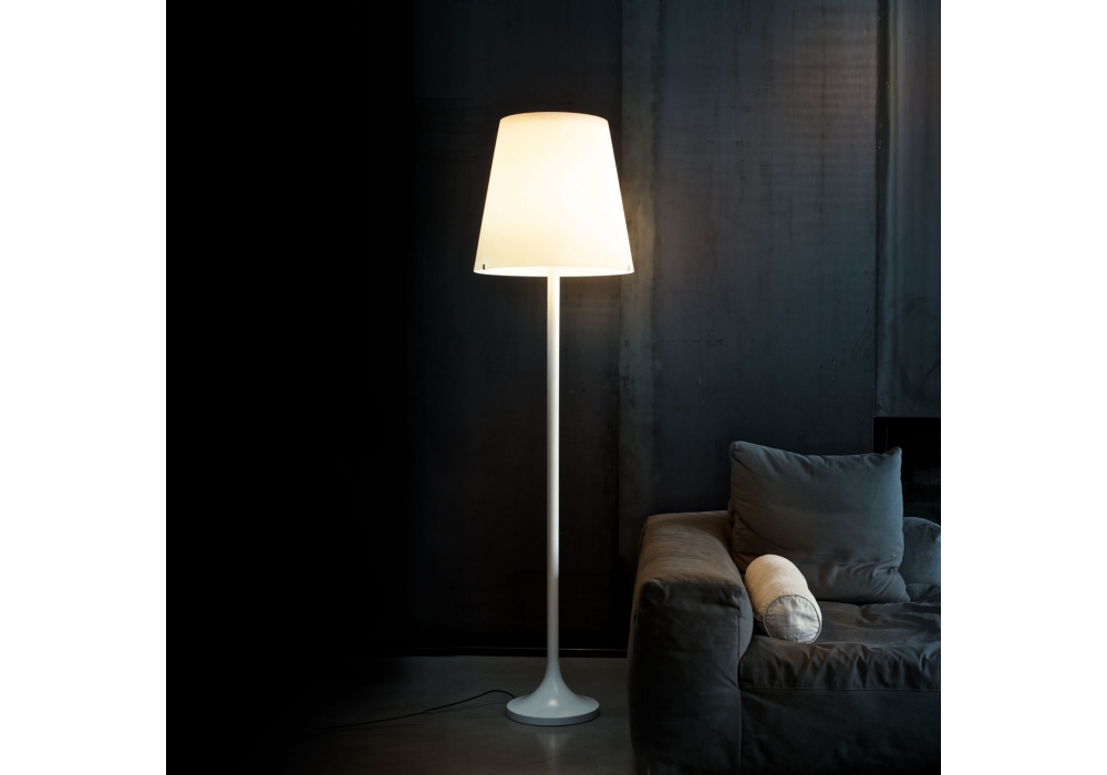 Lumen entworfen und hergestellt von Fontana Arte, ist eine Stehleuchte mit zwei Schaltern, Struktur aus weiß lackiertem Metall und Diffusor aus satiniertem, mundgeblasenem Glas. Teilweise dimmbare Stehleuchte mit Schiebeschalter. Schwarzes Netzkabel, Dimmer und Stecker.