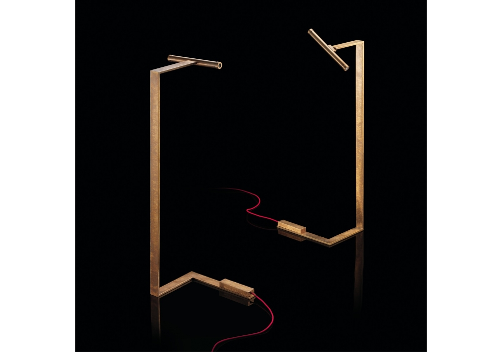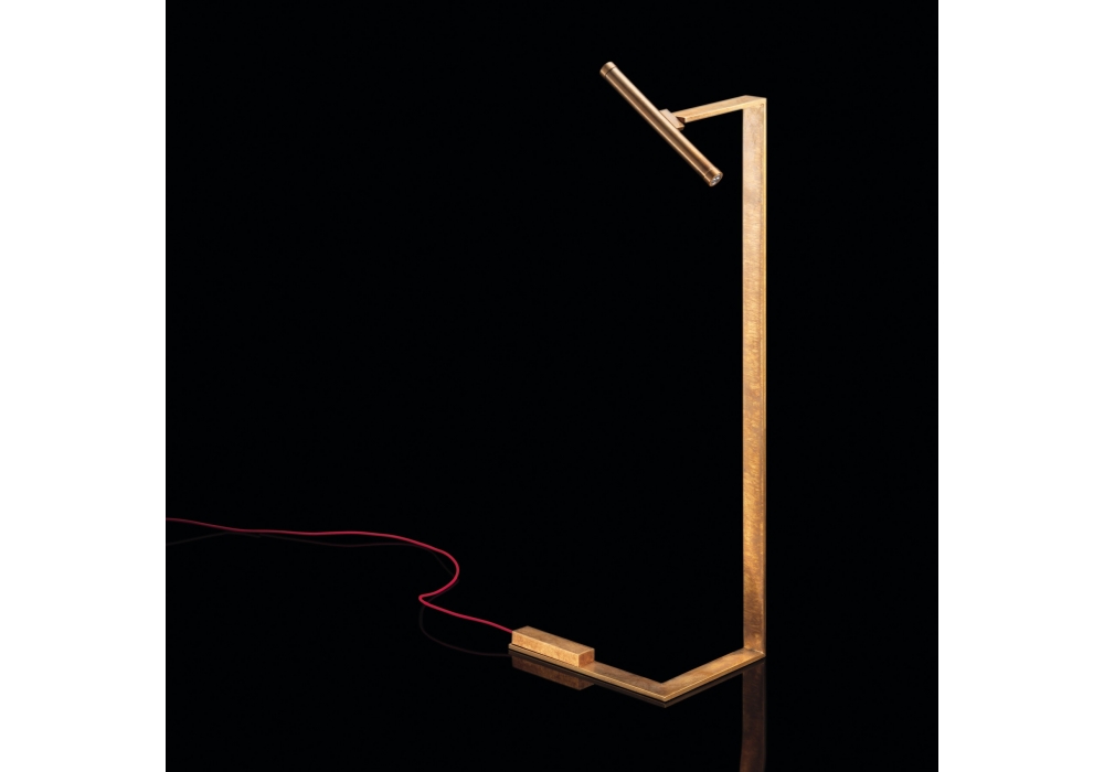 Flat von Massimo Castagna für Henge entworfen ist eine Stehlampe mit einer Struktur aus einem flachen Messingschaft. Der Kopf ist auf einer horizontalen Achse verstellbar und verwendet eine LED-Lichtquelle mit einem Stromkabel aus Kunststoffmaterial, das mit roter Seide überzogen ist. Flat ist in verschiedenen Ausführungen erhältlich.