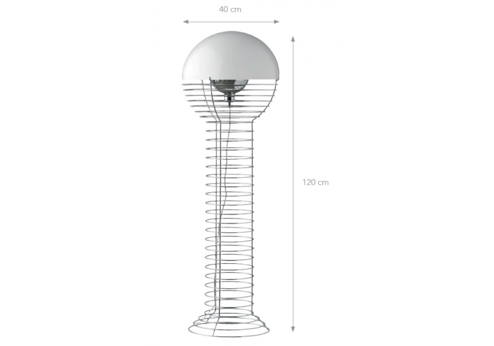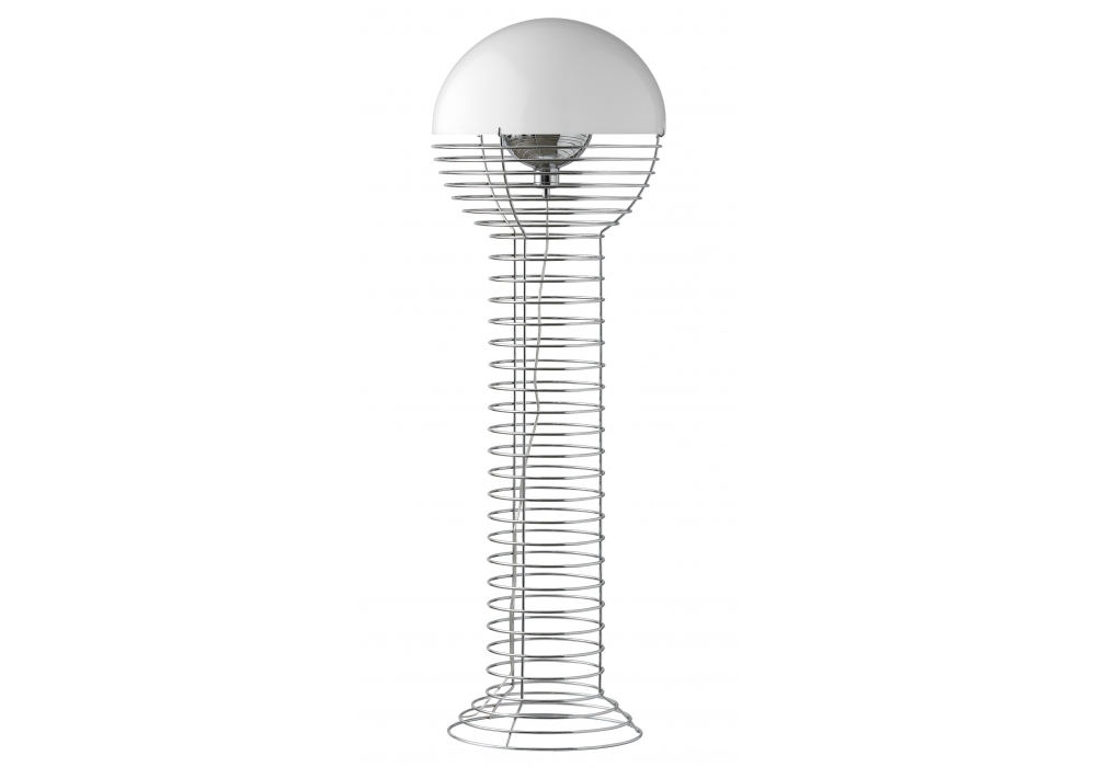 Wire von Verner Panton für Verpan entworfen, ist eine Stehleuchte mit einer zylindrischen Metallstruktur, die sich nach oben halbkugelförmig erweitert. Diffusor aus weißem oder orangefarbenem Kunststoff.