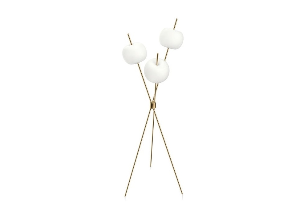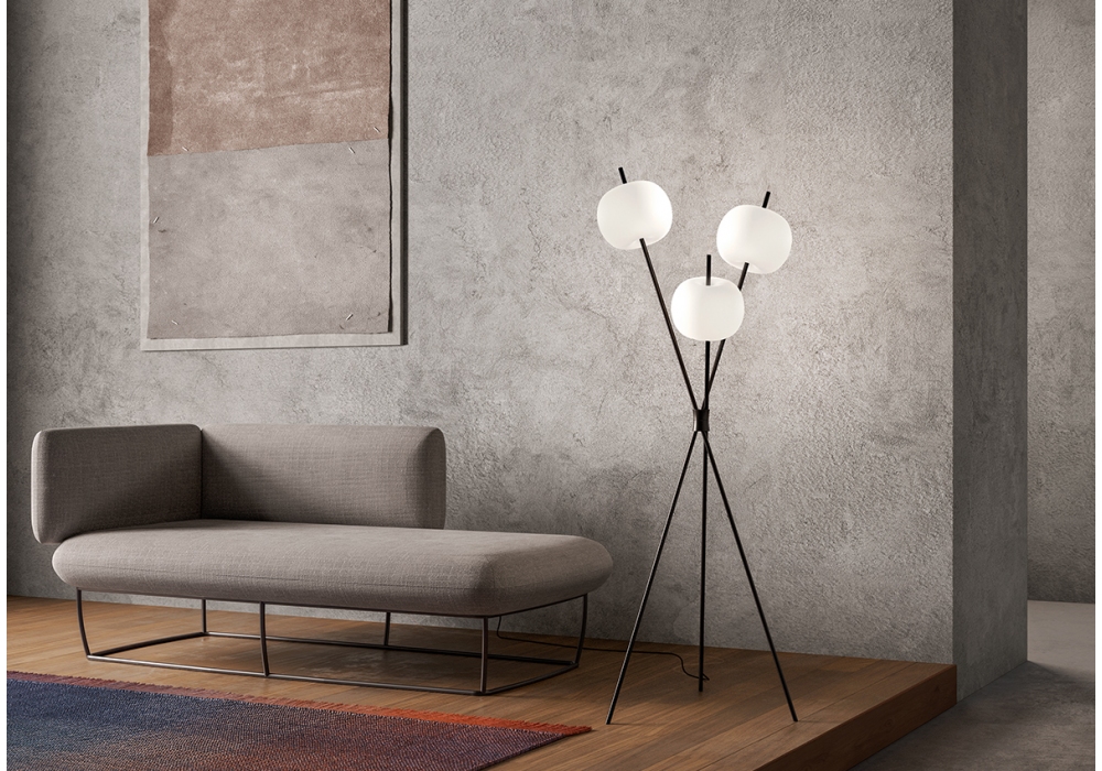 Kushi von Alberto Saggia & Valerio Sommella für Kundalini entworfen, ist eine Stehleuchte mit Schirm aus Opalglas, mundgeblasen und zweischichtig und Struktur aus Metall in Glanzlackfarben lieferbar: Schwarz, Kupfer und Messing.