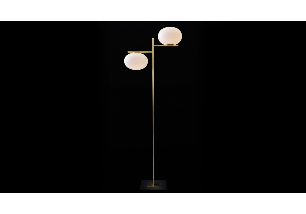 Alba, entworfen von Mariana Pellegrino Soto für Oluce, ist eine Stehlampe in zwei Versionen, die beide auf einem anthrazitfarbenen Sockel ruhen, aus dem ein rechteckiger Stiel in satiniertem Messing fließt. Vom oberen Endast, im ersten einen Arm, unter dem die Kugel aufgehängt ist, im zweiten zwei Arme in unterschiedlichen Höhen, die die leuchtenden Tropfen tragen.