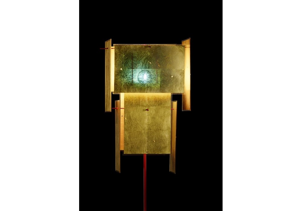 24 Karat Blau von Ingo Maurer ist eine Stehlampe mit rot lackierter Gestell und Lampenschirm mit acht Platten mit in Acrylglas eingegossenem Blattgold.