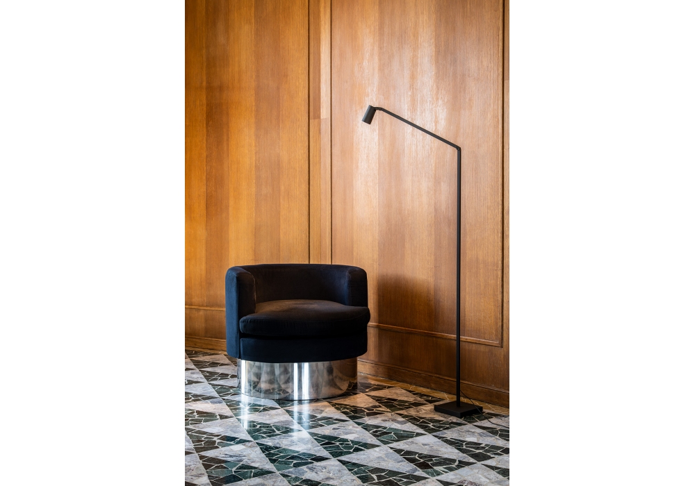 Untitled Reading Spot von Bernhard Osann für Nemo entworfen, ist eine Stehleuchte mit viereckiger Basis und röhrenförmiger Struktur aus lackiertem extrudiertem Aluminium. Der Diffusor hat eine zylindrische Form und beherbergt eine dimmbare LED-Lichtquelle in verschiedenen Lichtschattierungen.