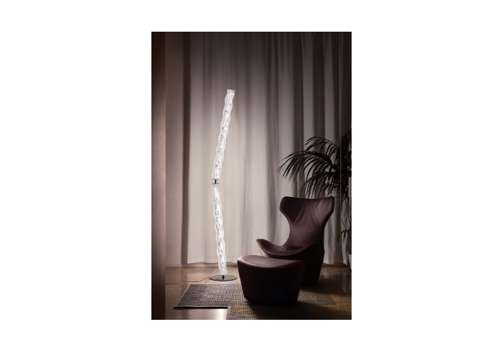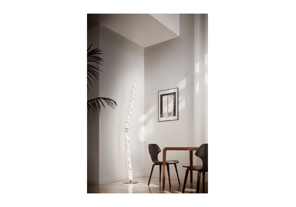 Hugo Floor entworfen und hergestellt von der Slamp Creative Department ist eine Stehleuchte mit Sockel und Tragstruktur aus Edelstahl. Der Lampenkörper ist mit Lentiflex® überzogen und verfügt über eine dimmbare LED-Lichtquelle.