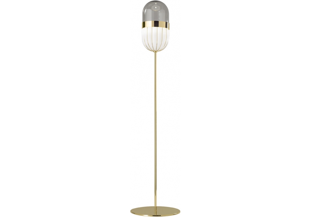 Pill 7237/LT1 von Matteo Zorzenoni für MMLampadari entworfen, ist eine Stehleuchte mit Metallstruktur (24 Karat Gold) und Glasdiffusor, die in zwei Farbvarianten erhältlich ist.