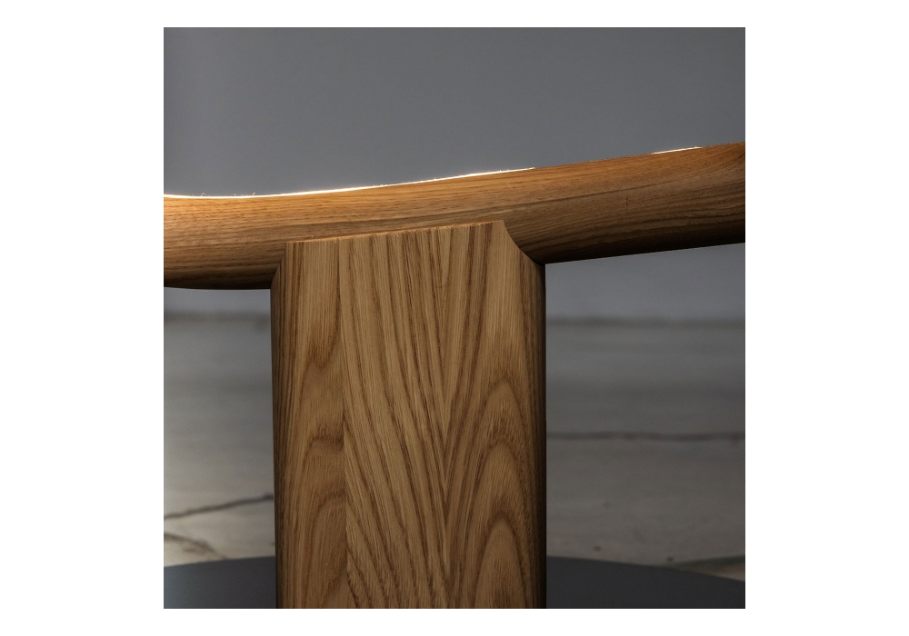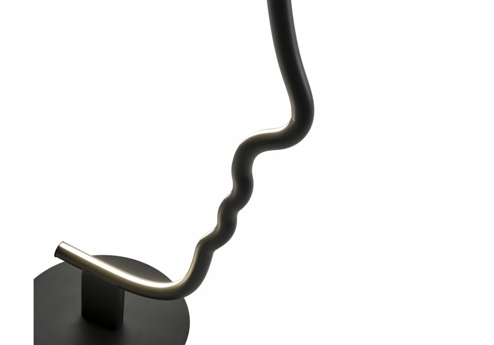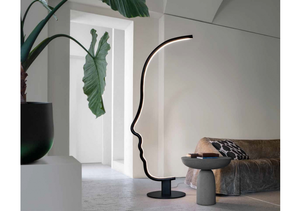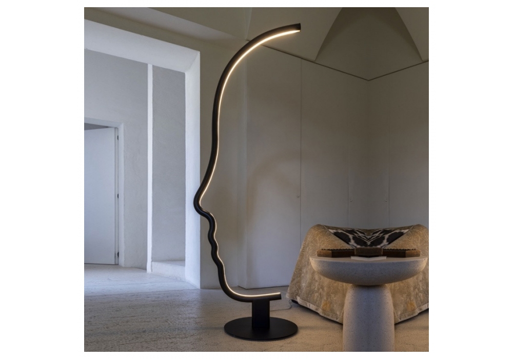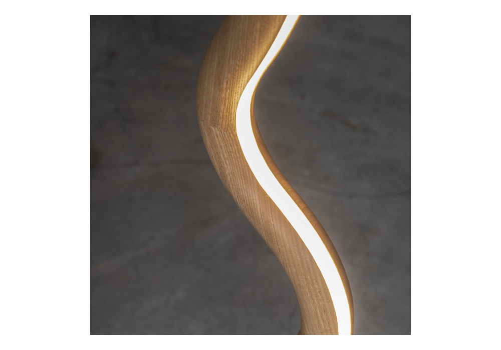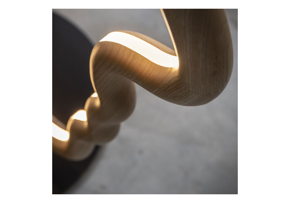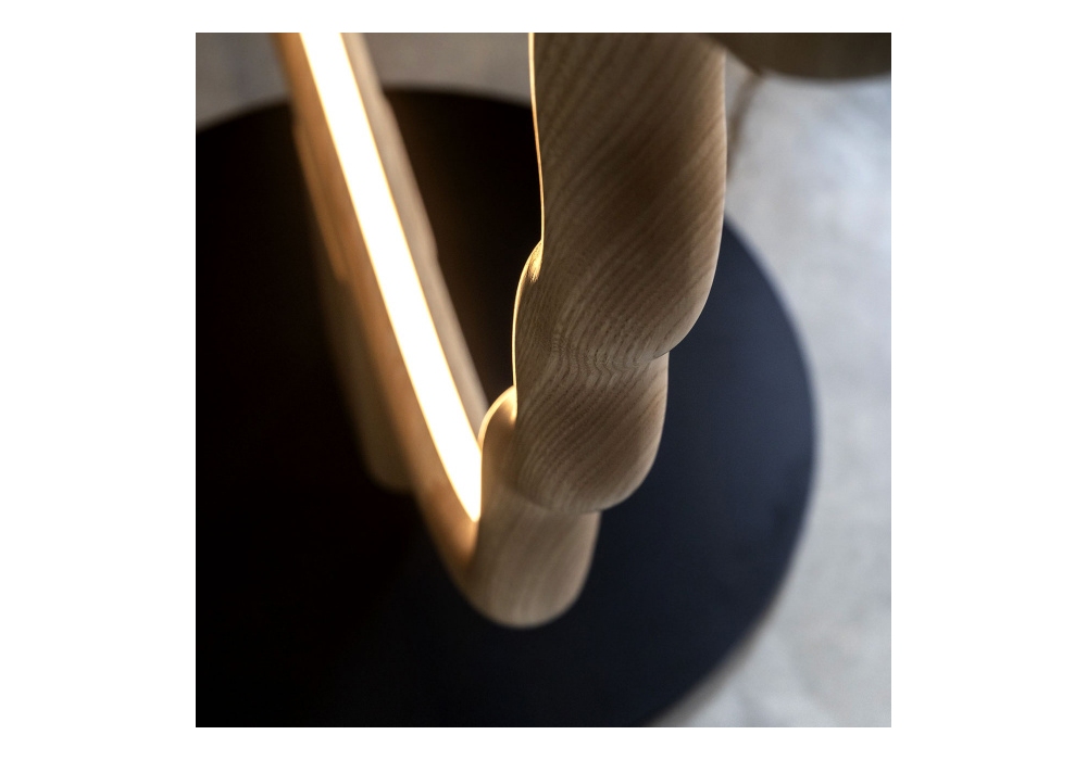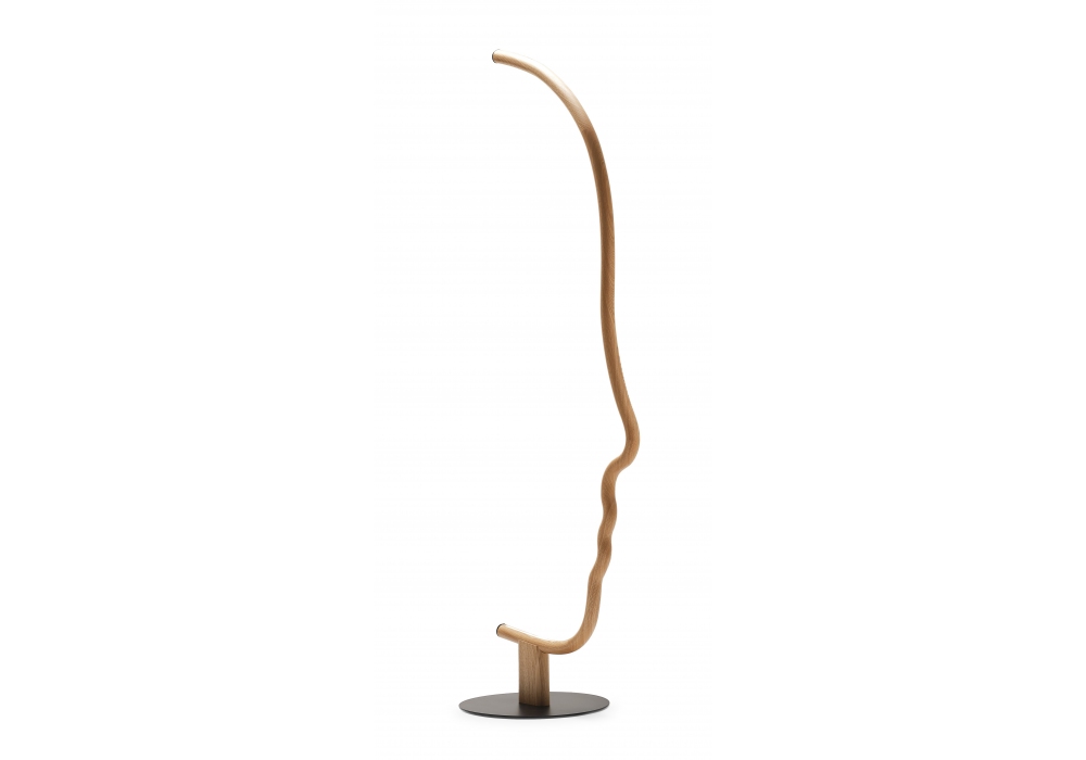 VIS a VIS von Gregorio Facco für Mogg entworfen, LED-Stehleuchte mit geformter Struktur aus Massivholz und Metallsockel. Erhältlich in Schwarz oder Kastanienbraun lackiert.
