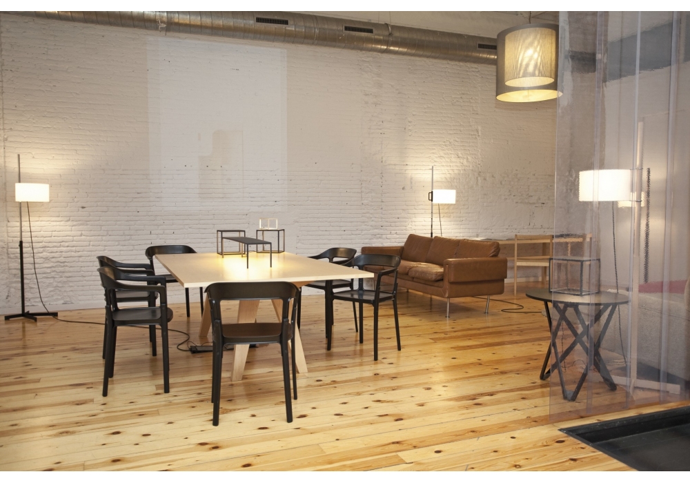 TMC von Miguel Mila für Santa&Cole entworfen, ist eine Stehleuchte mit verchromter und schwarzer Metallstruktur und verstellbarem Lampenschirm aus Methacrylat.