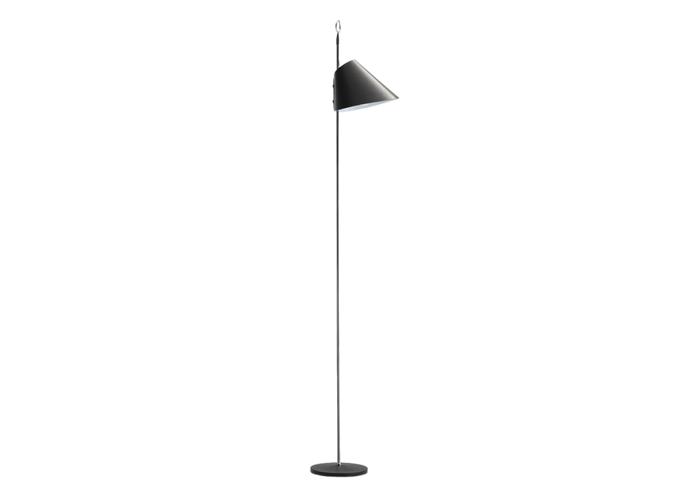 Monachella von Luigi Caccia Dominioni für Azucena entworfen, ist eine Stehleuchte mit verchromter oder messingfarbener Struktur, schwarz lackiertem Sockel und Lampenschirm in metallic-grauer Ausführung.